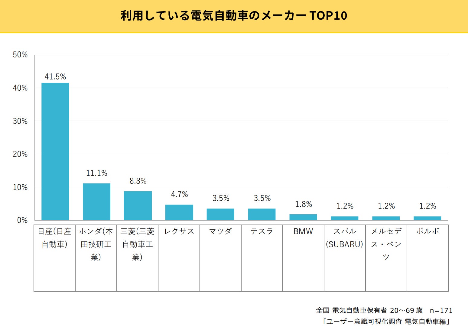乗っている電気自動車メーカー、3位「三菱」、2位「ホンダ」、1位は?