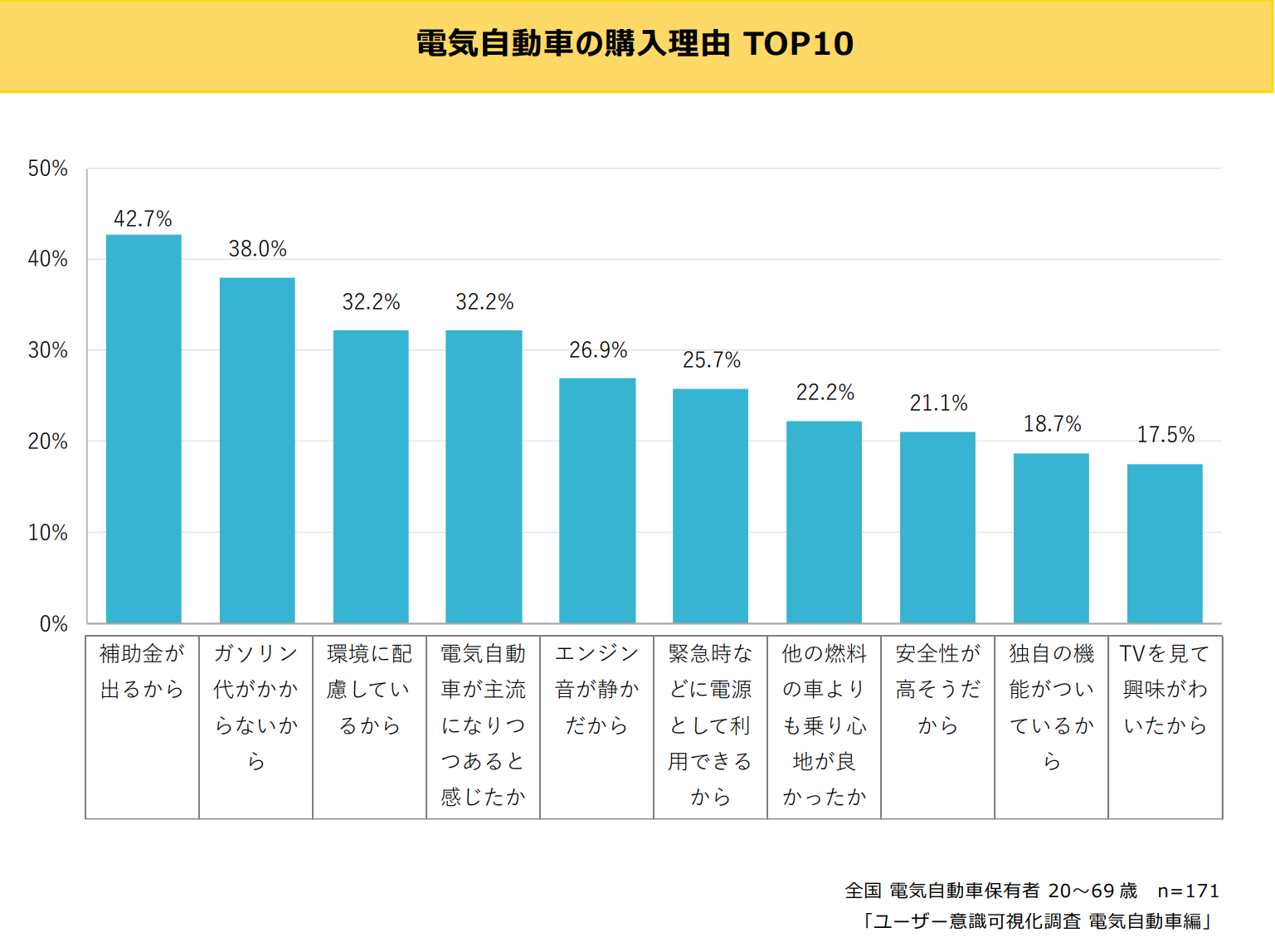 電気自動車ユーザーにきいた電気自動車の購入理由は、上位から「補助金が出るから」(42.7%)、「ガソリン代がかからないから」(38.0%)、「環境に配慮しているから」・「電気自動車が主流になりつつあると感じたから」(各32.2%)という結果に。