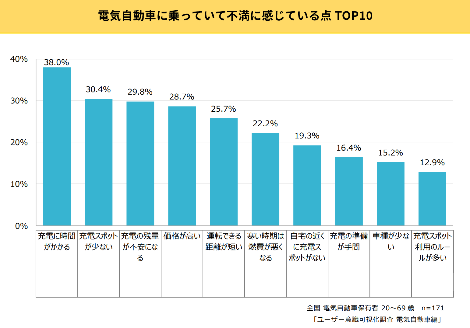 電気自動車に乗っていて不満に感じた点は、上位から「充電に時間がかかる」(38.0%)、「充電スポットが少ない」(30.4%)、「充電の残量が不安になる」(29.8%)、「価格が高い」(28.7%)という結果に。