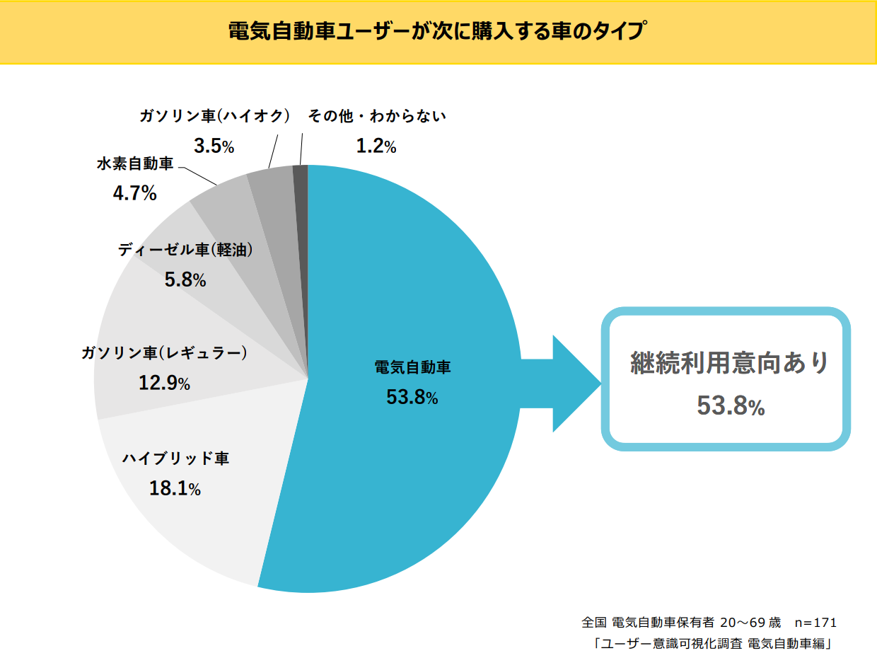 電気自動車ユーザーにきいた「次に車を購入する際の車のタイプ」の質問では、「電気自動車(53.8%)、「ハイブリッド車」(18.1%)、「ガソリン車(レギュラー)」(12.9%)、「ディーゼル車(軽油)」(5.8%)、「水素自動車」(4.7%)、「ガソリン車(ハイオク)」(3.5%)、「その他・わからない」(1.2%)という結果に。