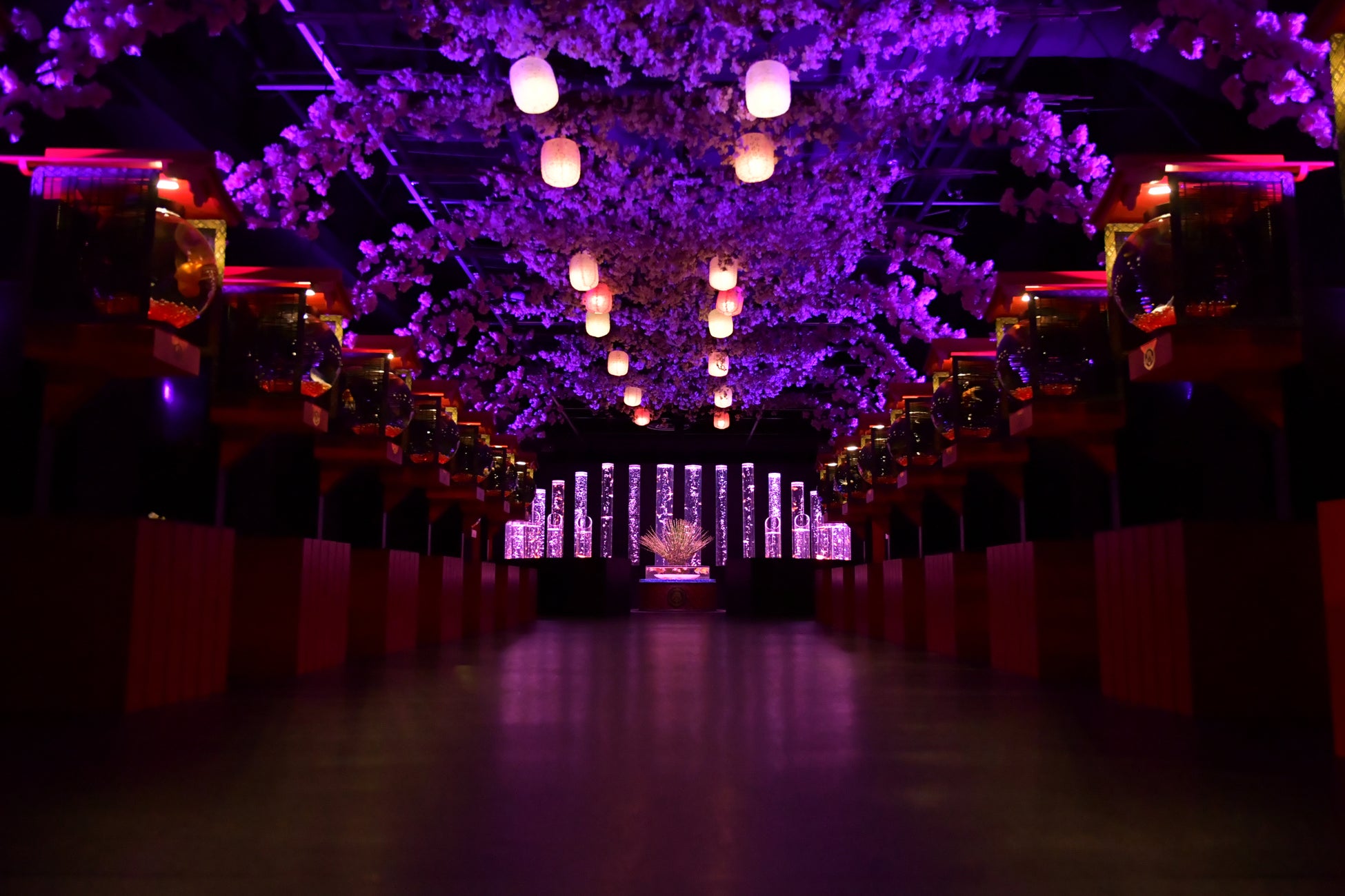 日本の寺社建築に見られる回廊を表現した空間に立ち並ぶ金魚の列柱。ずっと続いているかのように見えるこの空間に八重桜が飾られ、春らしい回廊になりました。左右に並ぶ色とりどりに光る水槽と、花びらが重なる景色がその先に続く“めっちゃ桜”な幻想世界へと誘います。