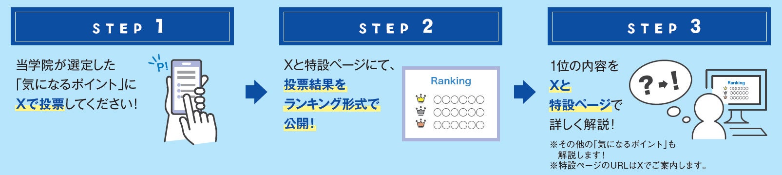 本試験で気になったポイントをXで受験生が投票。翌日14日(月)に投票結果をランキング形式で公開します。15日(火)に投票結果をうけて当学院が解説付きコメントを公表。試験終了後に受験生が抱えるモヤモヤした気持ちを当学院がスッキリ解決します!