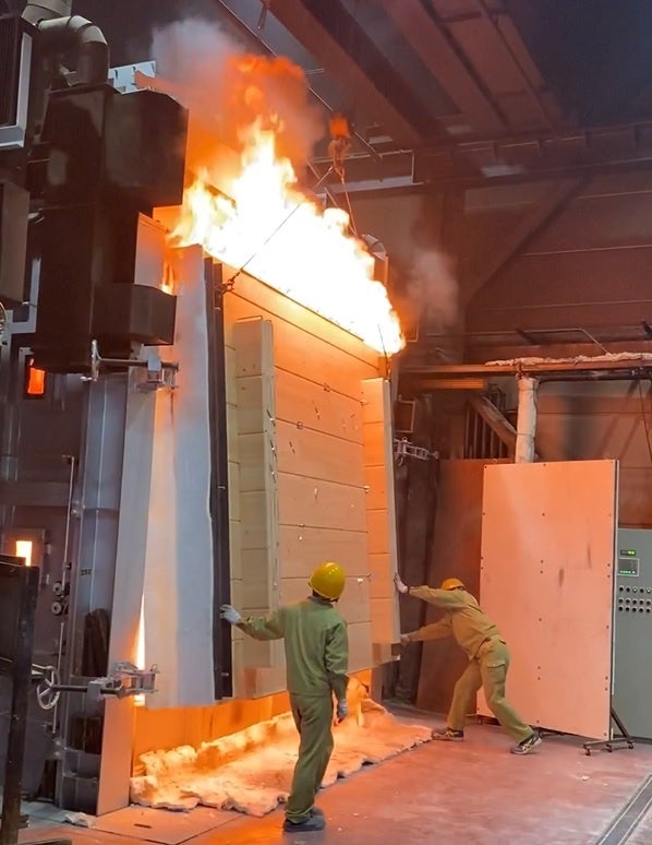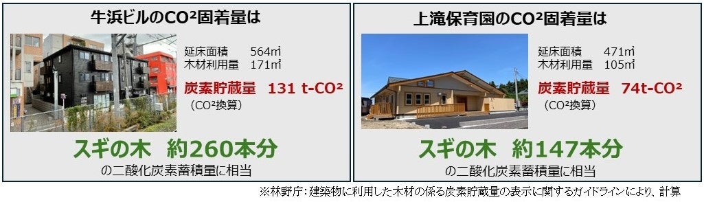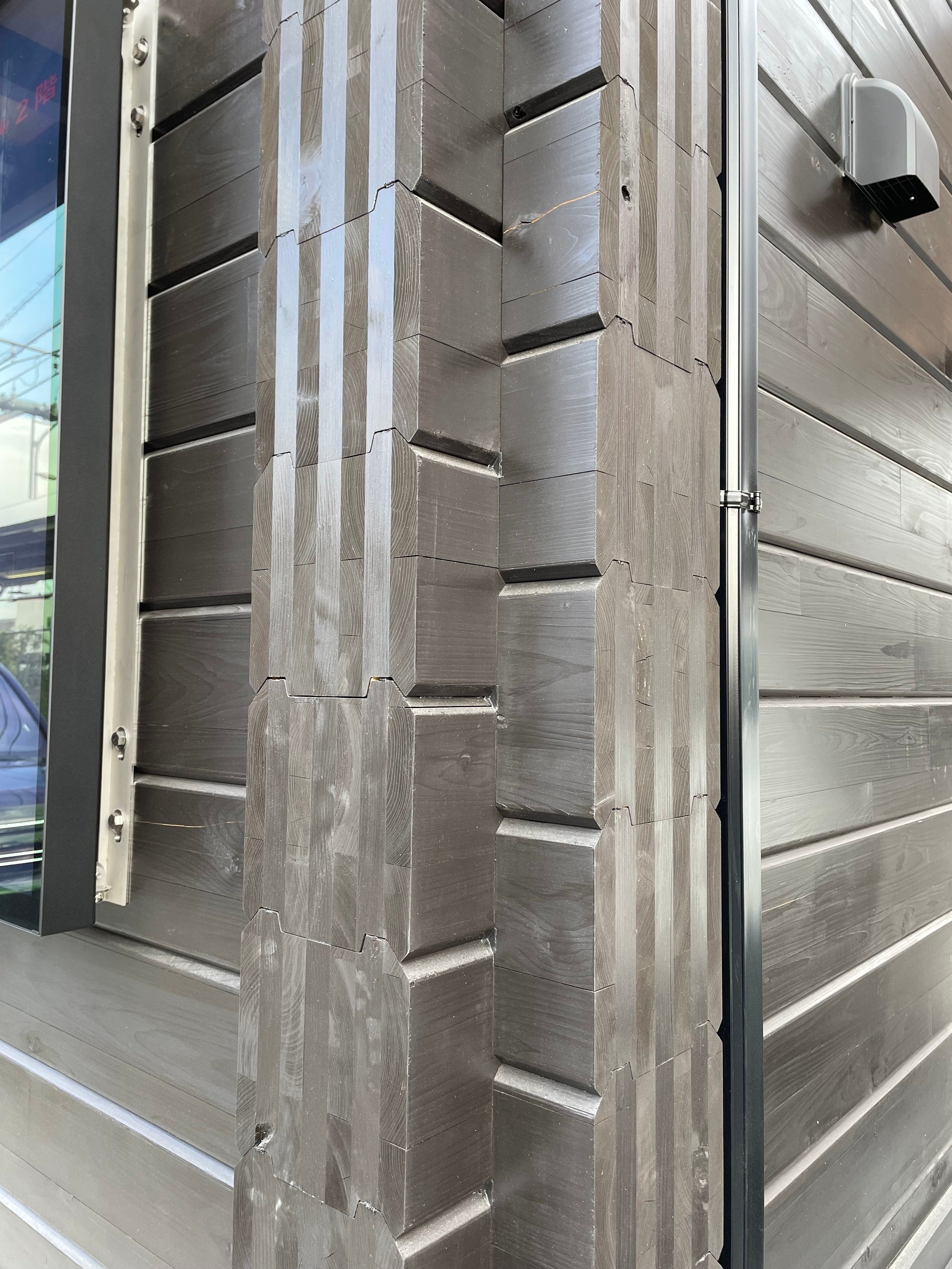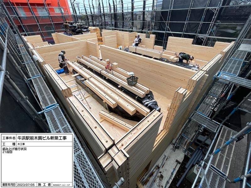 木材現わしのログハウスは、従来は防火地域では2階までしか建築ができませんでしたが、2023年2月に「90分準耐火構造認定」を取得することで、今回、JR青梅線 牛浜駅前という防火地域において、日本初となる3階建てCLTログハウスの建築が実現しました。建物は、1Fがオフィス、2F、3Fは8世帯の賃貸集合住宅として利用されます。CLTログハウスの日本での実績はまだ少なく、工法としての認知も低い状況ですが、長尺材が取れるCLTの活用と、防火認定の取得及び構造評定により、今後「個人住宅/共同住宅/中層ビル/商業施設」として、3階建てまでの建築が可能となります。