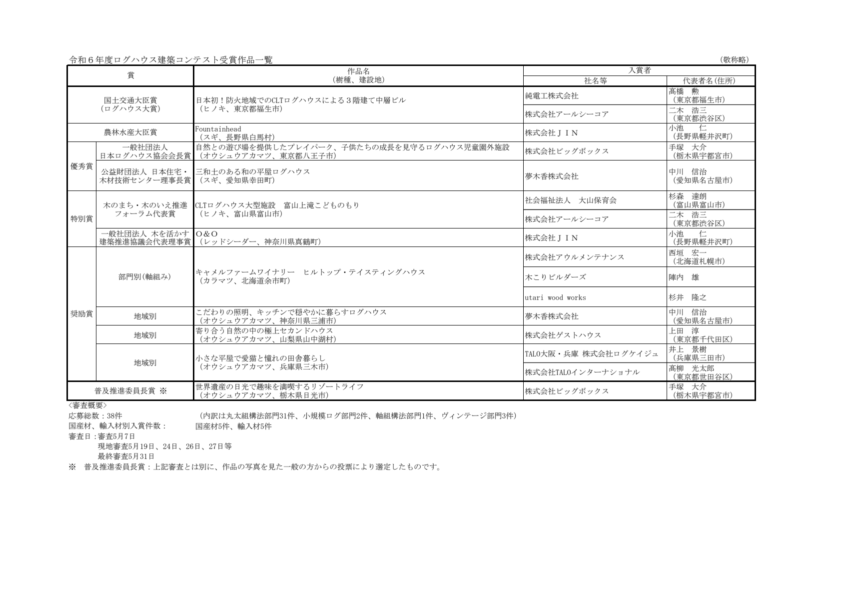一般社団法人日本ログハウス協会主催、国土交通省・農林水産省等後援。優れた発想・夢のもとでのログハウスの設計提案で、建築技術、地域材利用等の点において優秀と認められるものを顕彰し、ログハウスの普及・発展を図り、木材需要の拡大、森林資源の循環的活用の促進による地球温暖化防止及び国民生活の向上に寄与することを目的に、年1回開催される建築コンテスト。