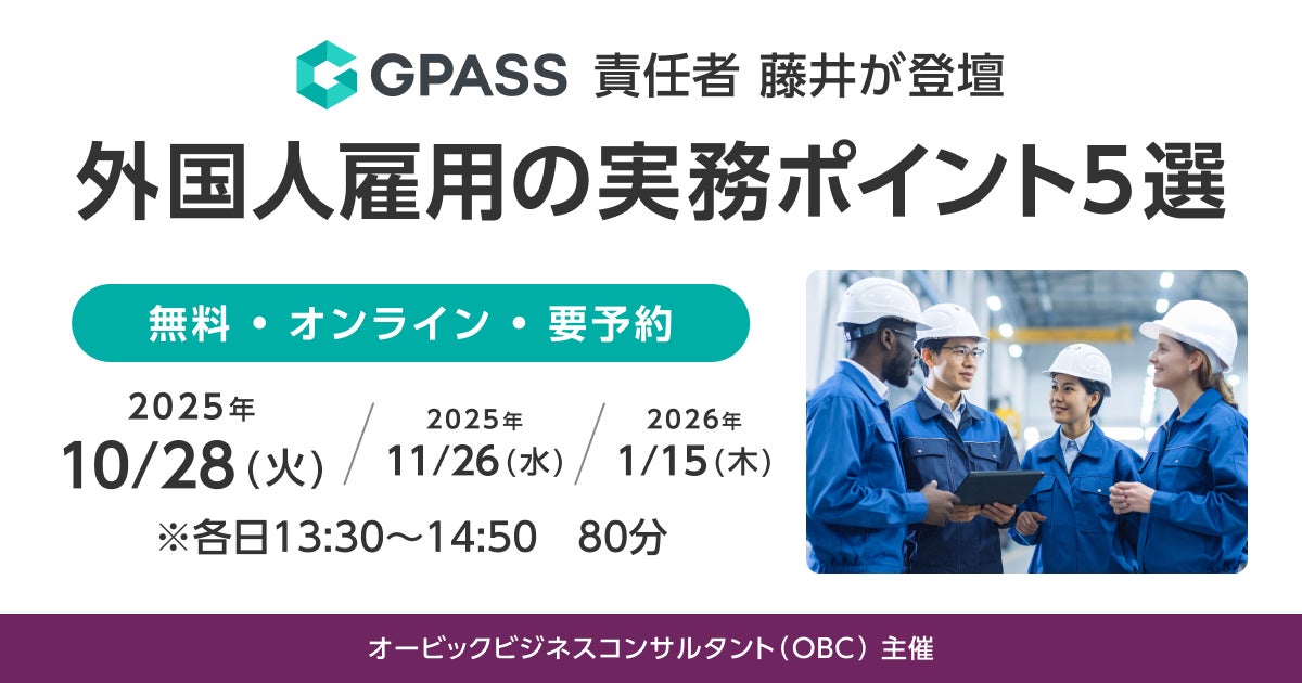 ELEMENTSグループの株式会社Liquid(本社:東京都中央区、代表取締役:長谷川 敬起)は、2025年10月28日(火)、11月26日(水)、2026年1月15日(木)に開催される株式会社オービックビジネスコンサルタント(本社:東京都新宿区、代表取締役社長:和田 成史)主催、杉田 昌平弁護士による「外国人雇用の実務ポイント5選」ウェビナーに、当社の外国人材管理システム「GPASS」の事業責任者 藤井が登壇することをお知らせします。