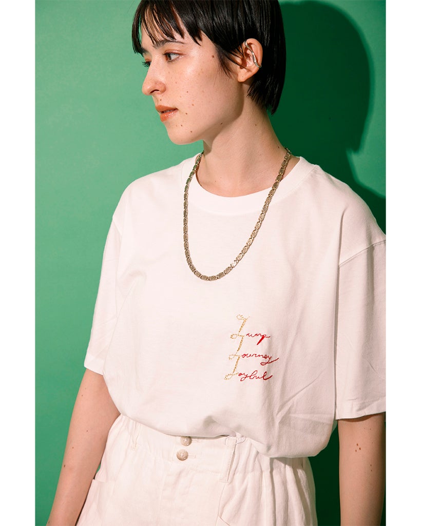 今回のコラボレーションのテーマでもある、JOHNBULLの頭文字「J」のつく3つの言葉、Jump(飛ぶ思考)、Journey(旅するイメージ)、Joyful(生きる喜び)をタイポグラフィで胸元にあしらったメッセージ性のあるデザイン。