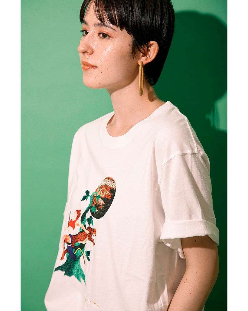 コラボレーションのテーマでもある「J」からJupitar(木星)、Jaguar(ジャガー)、running long jump(走り幅跳び)、Jack and the Beanstalk(ジャックと豆の木)4つを連想しかけ合わせた、生命力を感じる力強いアーティスティックな1枚。人間の身体能力、野生動物の生命力、宇宙の神秘、ファンタジーの世界を融合させた力強いこちらのデザインはメンズタイプも展開。S,M,Lの3サイズ。