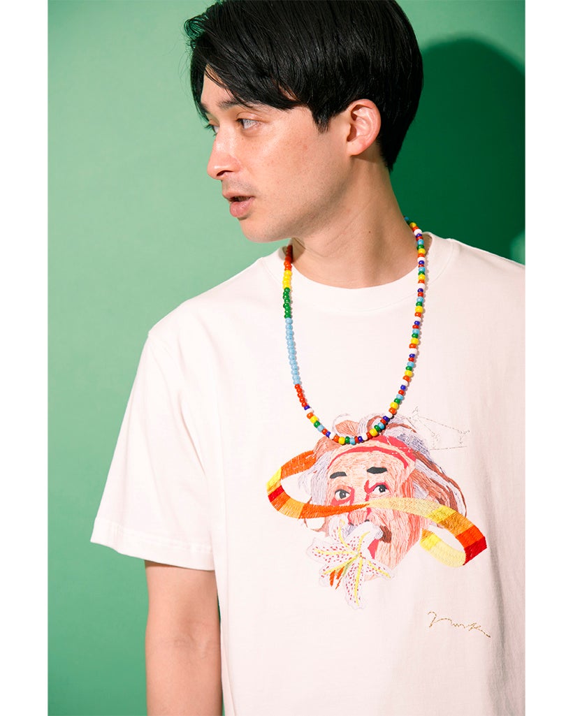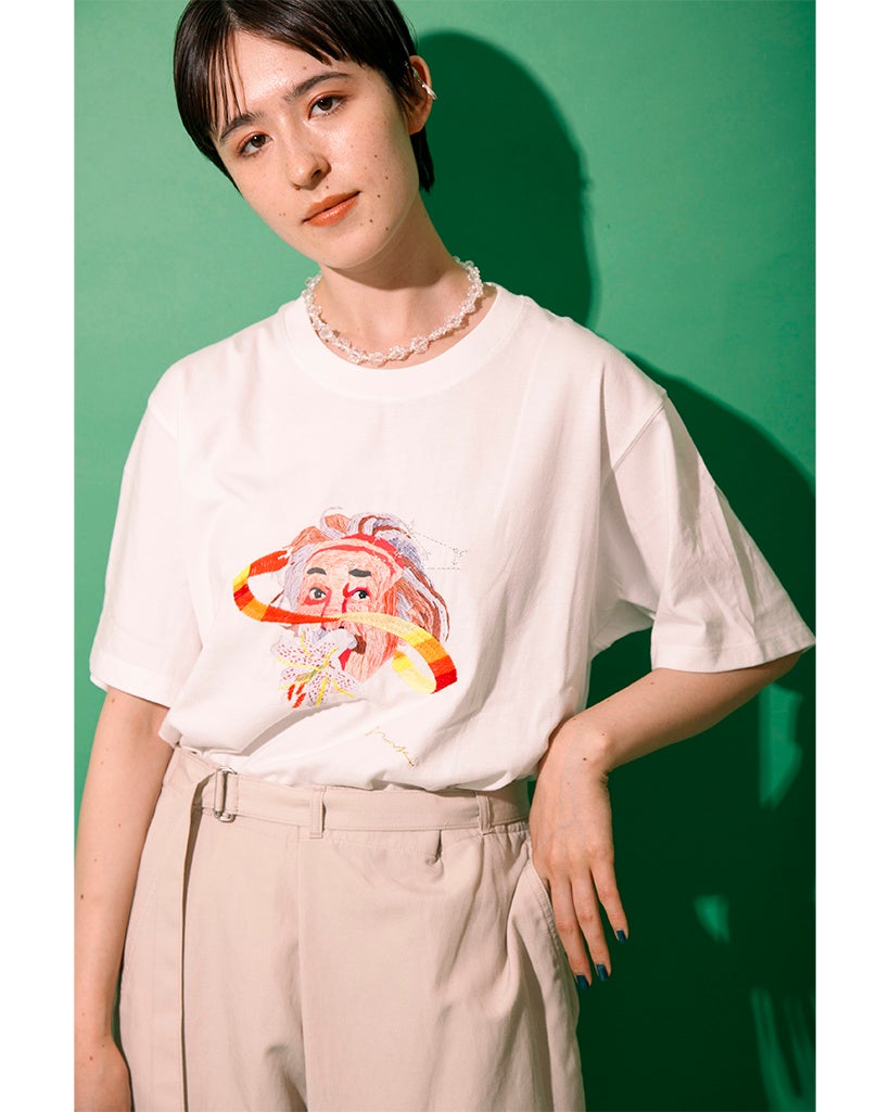 存在感のあるプリントと刺繍のコンビネーションがTシャツを1枚で着る時期に大活躍。メンズレディース同デザインでご用意しているジーニアスTシャツは、カラフルな刺繍のカラーリングをいかしてカラーパンツなど遊びを効かせたスタイリングもおすすめ。