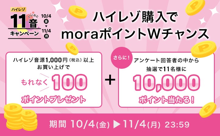 日頃の感謝を込めて、10月4日(金)から11月4日(月)の期間中、ハイレゾ音源を合計1,000円(税込)以上購入された方に、もれなくmoraポイント100ptをプレゼントいたします。さらに、アンケートに回答いただいた方の中から抽選で11名様に10,000ptが当たるWチャンスも実施いたします。