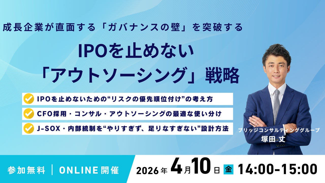 公認会計士人材の知見・経験を活用した経営支援サービスを展開するブリッジコンサルティンググループ株式会社(所在地:東京都港区、代表者:宮崎良一)は、2026年4月15日(水)に、「成長企業が直面する『ガバナンスの壁』を突破する 〜IPOを止めない『アウトソーシング』戦略〜」をテーマとした無料オンラインセミナーを開催します。