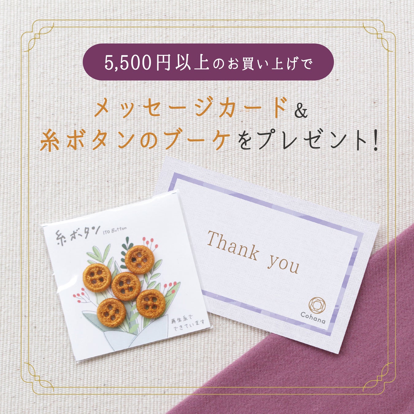 この敬老の日ギフトの期間中、Cohana オンラインストアまたは Cohana 日本橋本店にて、限定商品に限らずどの商品でも税込5,500円以上ご購入いただいたお客様に、敬老の日ギフトとして添えて使っていただけるオリジナルメッセージカードと糸ボタンのブーケをプレゼントいたします。