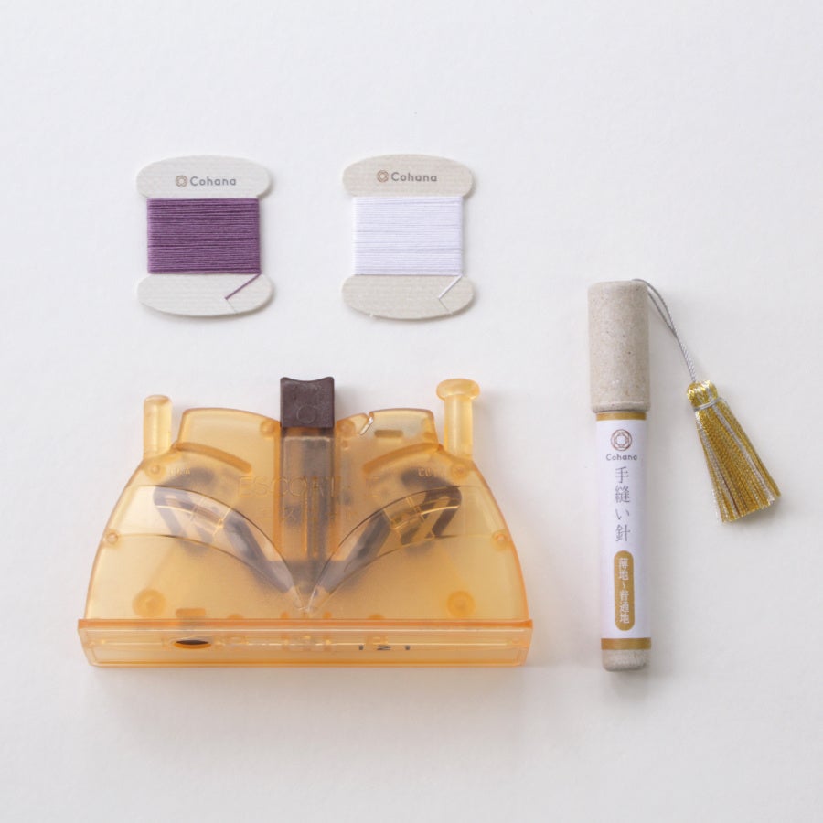人気の 簡単糸通し をメインにCohanaの 手縫い針セット(薄地~普通地) と 縫い糸(白と紫苑色) をセットにしました。簡単糸通しは、針と糸をセットしてボタンをプッシュするだけで、糸通しが完了するすぐれもの。糸通しのストレスが解消されれば、いつものハンドメイドがもっと楽しくなるはずです。