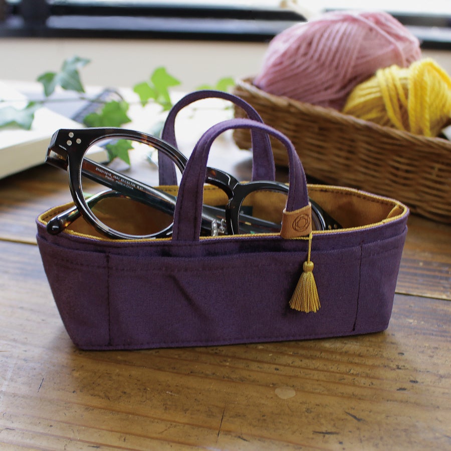 帆布の豆道具入れ・簡単糸通し・浜松のリネンのヒノキのピンクッション・豆巾着・豆ばさみ・七宝の待針・縫い針・ 縫い糸(白・黒)の豪華なセットです。帆布の豆道具入れの落ち着いた紫苑色を、支子色のライナーとタッセルが鮮やかに引き立てます。お道具の収納はもちろん、眼鏡ケースとしての用途も人気です。
