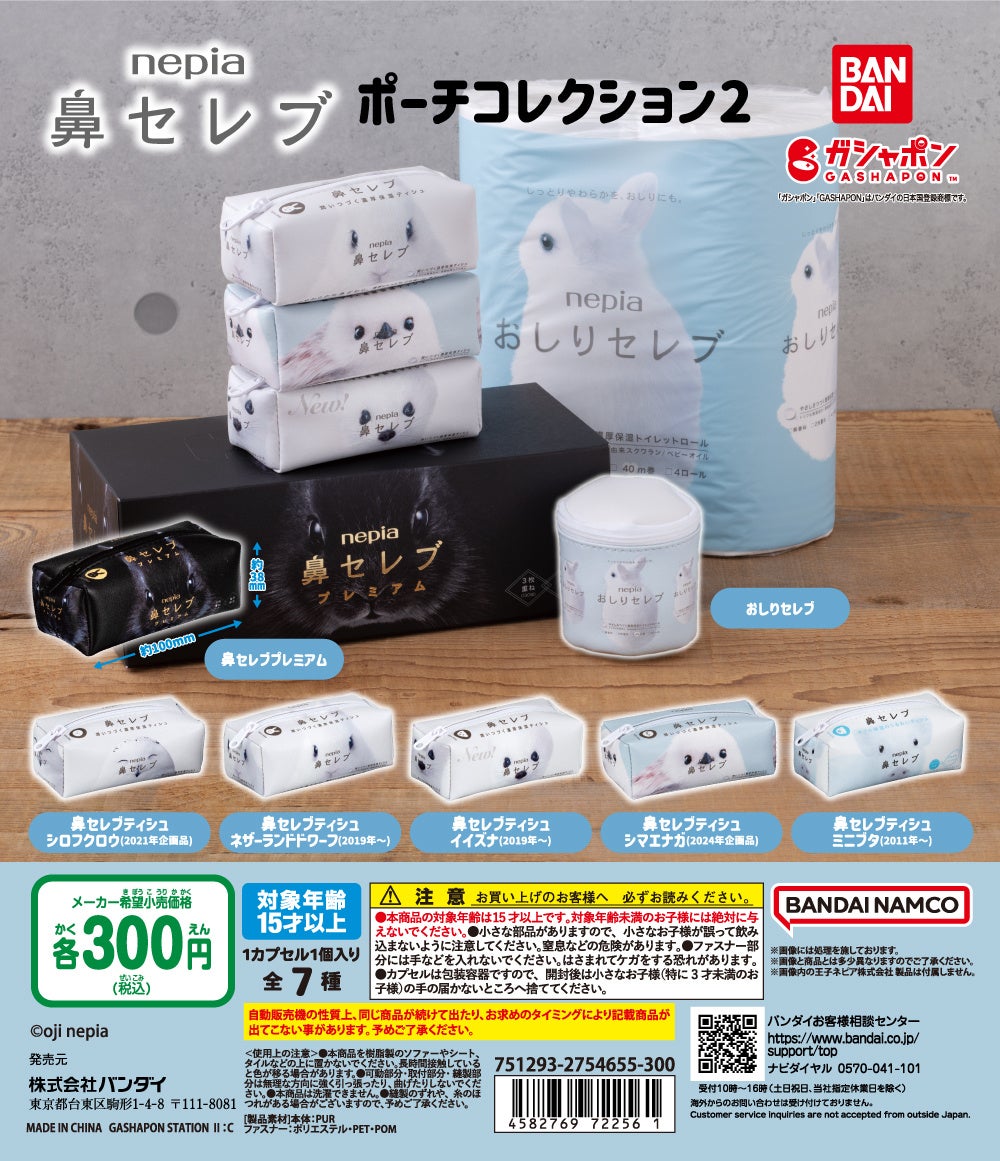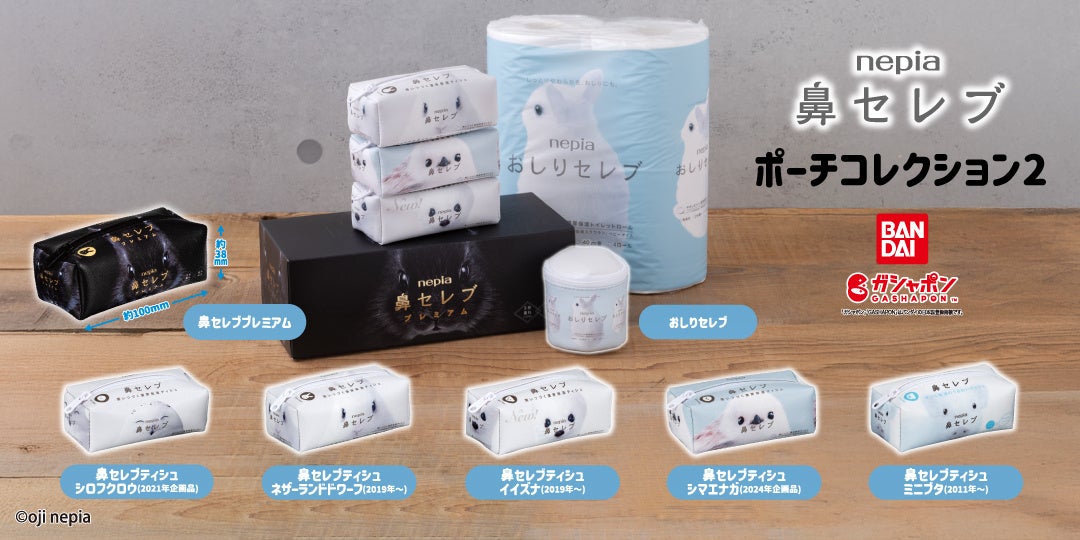 王子ネピア株式会社(本社:東京都中央区、代表取締役社長:森平高行)は、「ネピア 鼻セレブティシュ」ブランドと株式会社バンダイ ベンダー事業部(本社:東京都台東区)が展開するカプセルトイブランド「ガシャポン®」とのポーチコレクション第2弾を実施します。「nepia ⿐セレブ ポーチコレクション2」(1回300円・税10%込、全7種)が、2025年2⽉第3週から順次、全国のガシャポンバンダイオフィシャルショップ、玩具売り場・量販店・家電店などに設置されたガシャポン自販機シリーズに登場します。