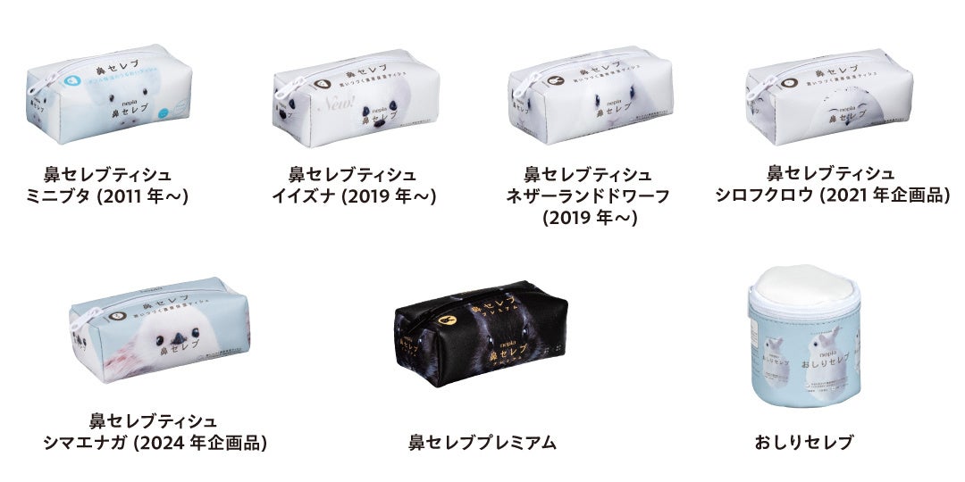 「nepia 鼻セレブ ポーチコレクション」の第2弾となる本商品では、第1弾で人気のあった「ネザーランドドワーフ」が再登場。加えて、高級感のある黒うさぎが特徴の「鼻セレブプレミアム」のほか、復刻デザインとして「シマエナガ」「シロフクロウ」「ミニブタ」「イイズナ」のポーチ(タテ約38mm×ヨコ約100mm)が登場。さらに、「おしりセレブ」の丸型ポーチ(直径約70mm×高さ約70mm)も加わった全7種です。