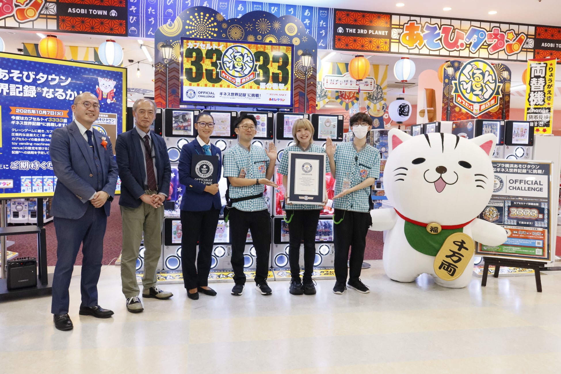株式会社サードプラネット(横浜本社:神奈川県横浜市、代表取締役社長:志野和夫、以下「当社」)は、本日、ギネス世界記録™公式認定員の立ち合いの元、「サープラ横浜あそびタウン」のカプセルトイ機の設置数が「3333面」でギネス世界記録™に認定されました。2022年7月22日に認定されたクレーンゲームの設置台数555台と合わせて、ダブルギネス世界記録™認定となりました!