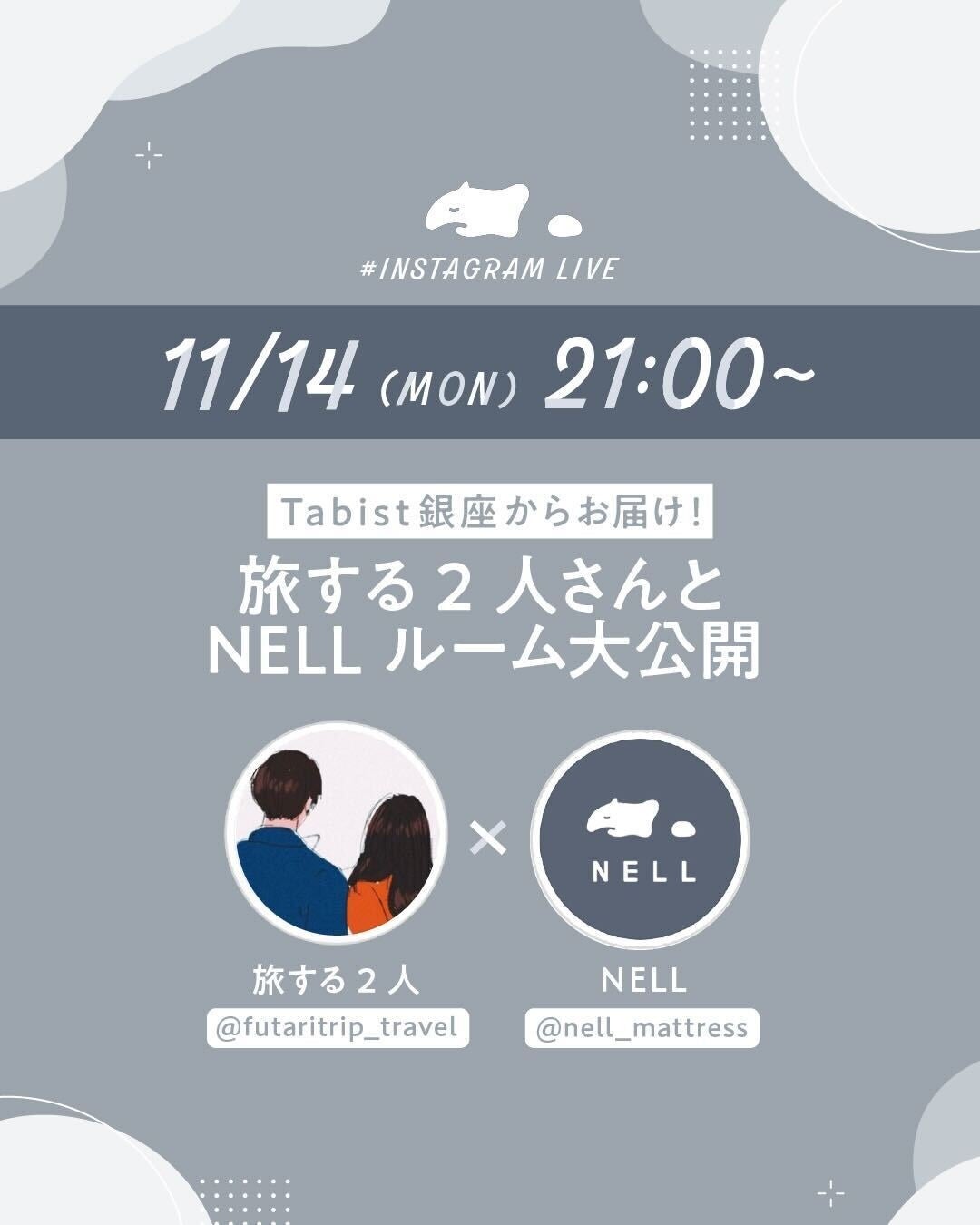 『NELLルーム』のオープンを記念して、NELL公式Instagramにて、フォロワー14.9万人の人気インフルエンサー「旅する2人〜趣味も仕事も旅行のカップル〜」さんとのコラボライブを、11/14(月)に『NELLルーム』より配信いたします。