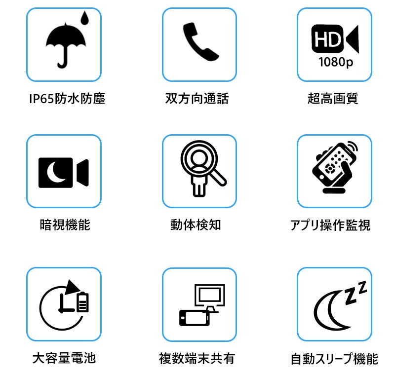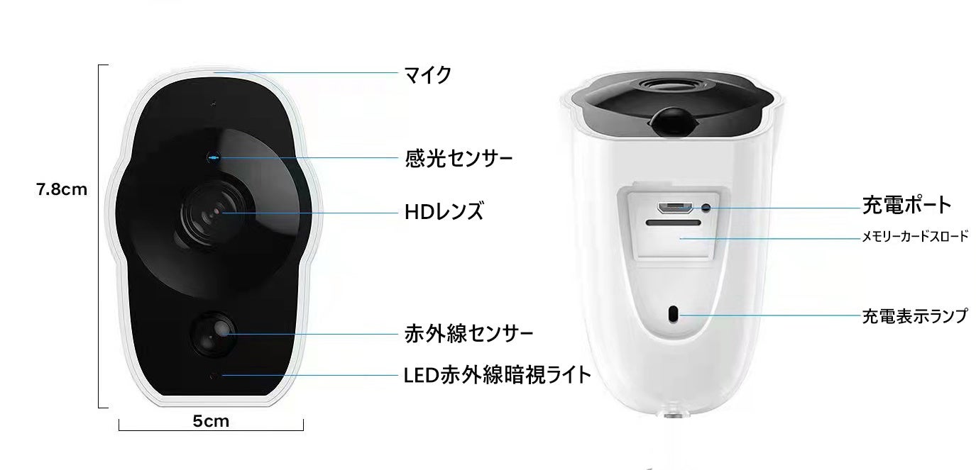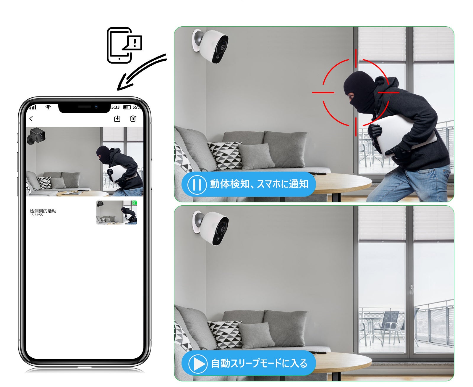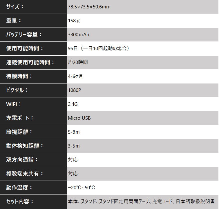 大容量3300mAhバッテリーと省エネルギー設計で待ち受け時間が長い!動体の検知がない時は自動的にスリープモードに入る省エネ設計によりバッテリーの消費を大幅に抑えています。1日10回起動した場合でも最大なんと約95日間待ち受け可能!