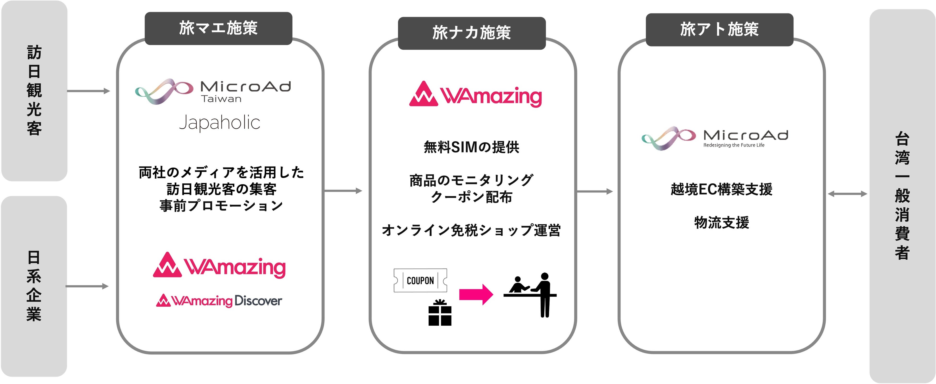 マイクロアド台湾が運営するメディア「Japaholic」と、WAmazingが運営する訪日旅行メディア「WAmazing Discover」にて、WAmazingの運営する旅行予約サイトや、オンライン免税ショッピングサービスへ、訪日観光客の集客を促すプロモーションを行います。そして、旅行予約後の訪日観光客に対して、旅マエの情報発信を行います。