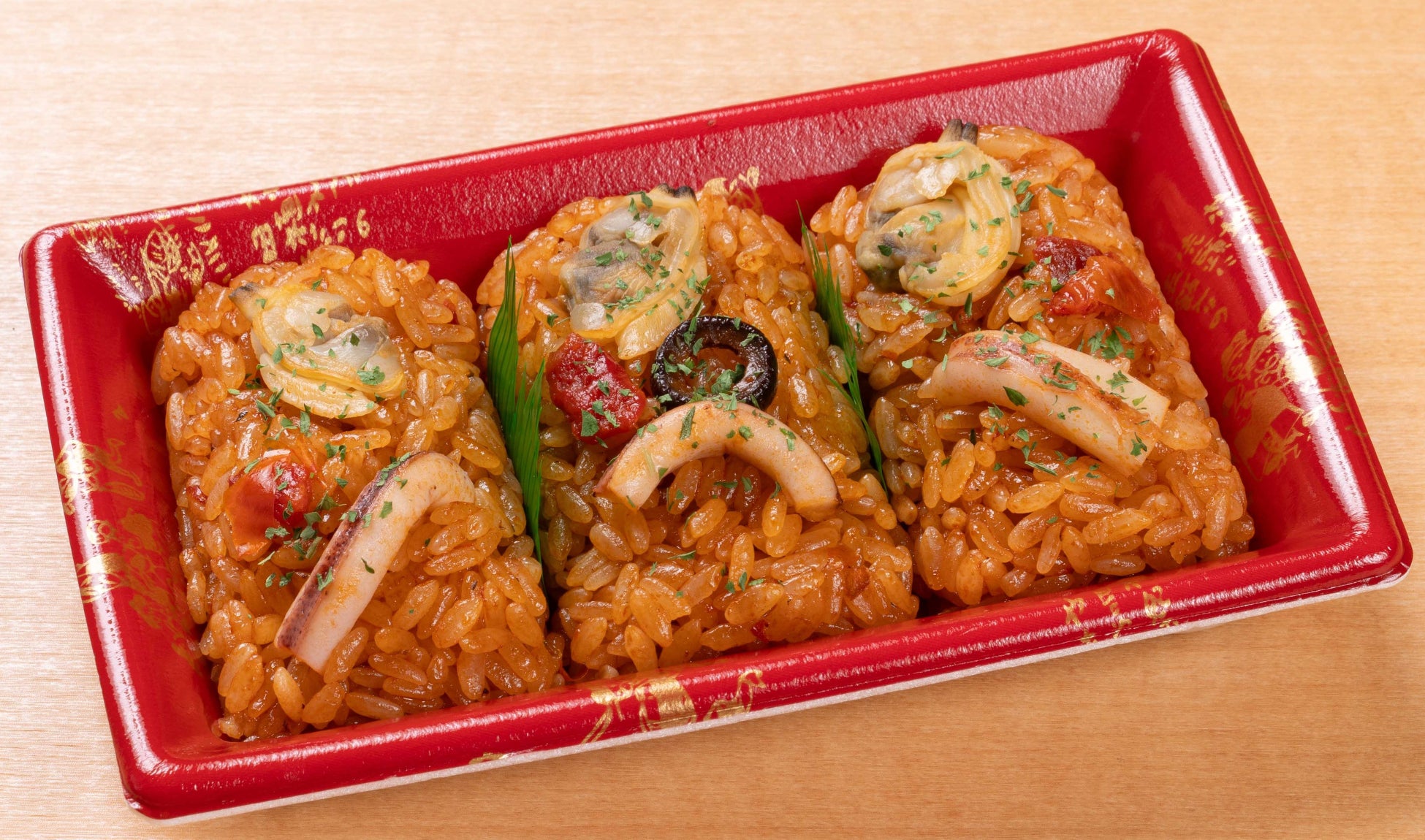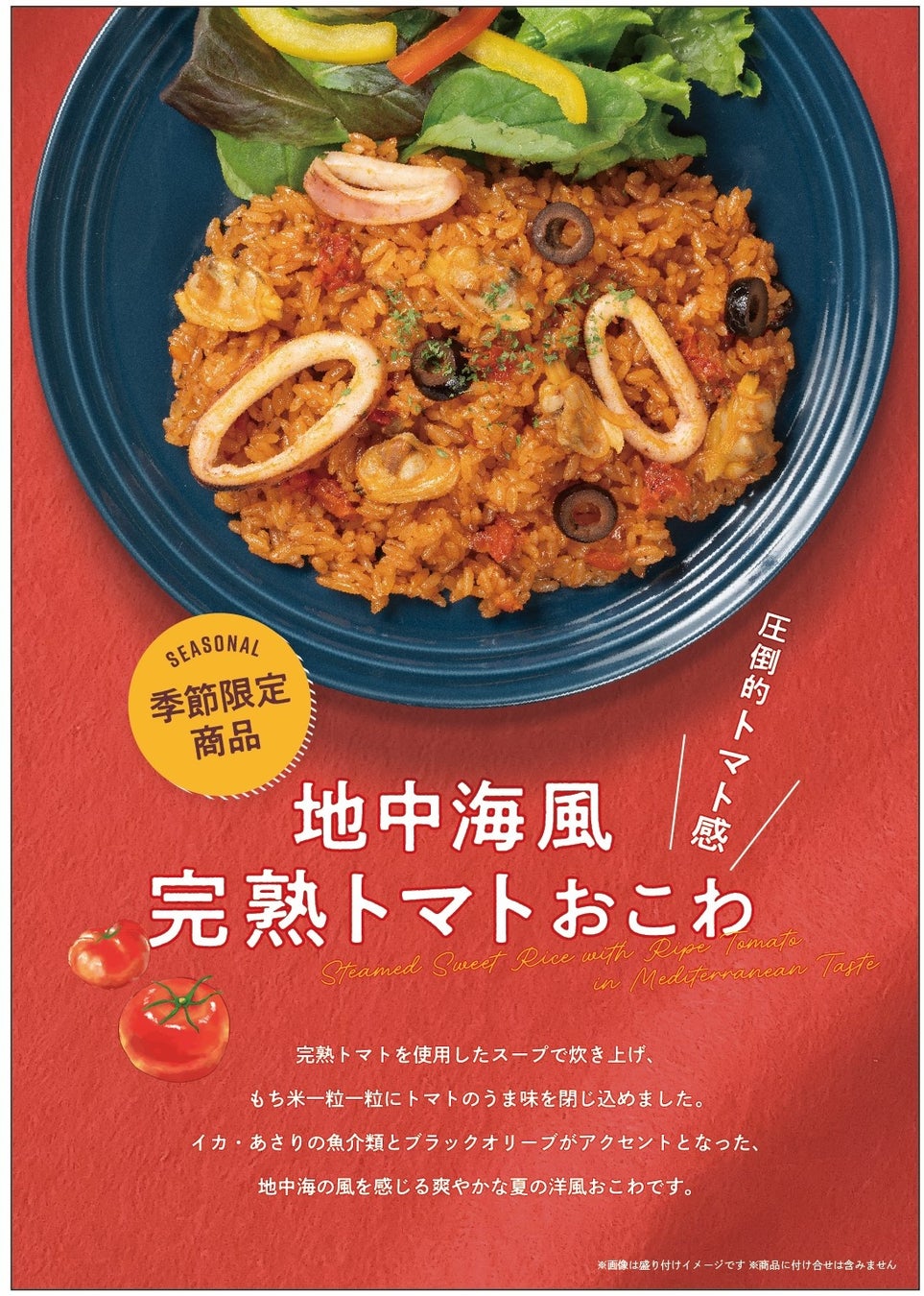 もち米を完熟トマトスープで炊き上げ、トマトの旨みを一粒一粒に閉じ込めました。イカ・あさりの魚介類とブラックオリーブがアクセントとなり、夏でも食べやすい、爽やかな味わいの洋風おこわです。