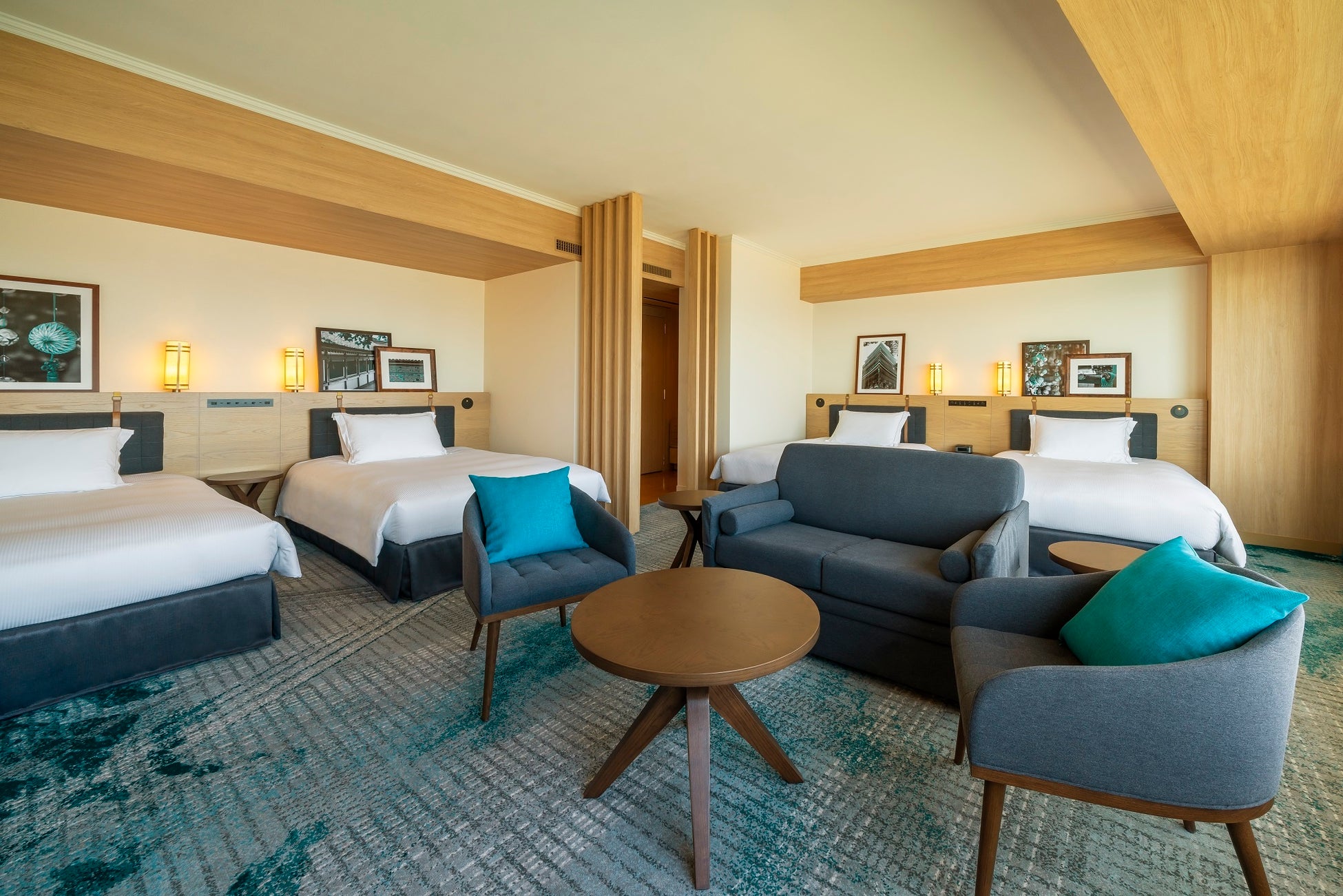 ヒルトン福岡シーホークには、ツイン、ダブルの客室のほか、最大6名様までご宿泊可能な和室、ベッド4台を配置した「ファミリープレミアムデラックス」や、2部屋が内扉で繋がるコネクティングルームなど家族旅行やグループ旅行に最適な多種多様なお部屋がございます。お孫さんと一緒に過ごす3世代旅行や、卒業、進学など新たな旅立ちをお祝いする記念旅行などにご利用ください。