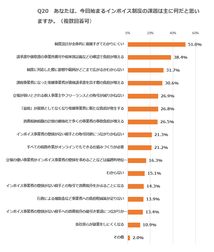 今回のインボイス制度の主な課題を複数回答で聞くと「制度設計が全体的に複雑すぎて分かりにくい」51.0%が最多だった。(Q20)