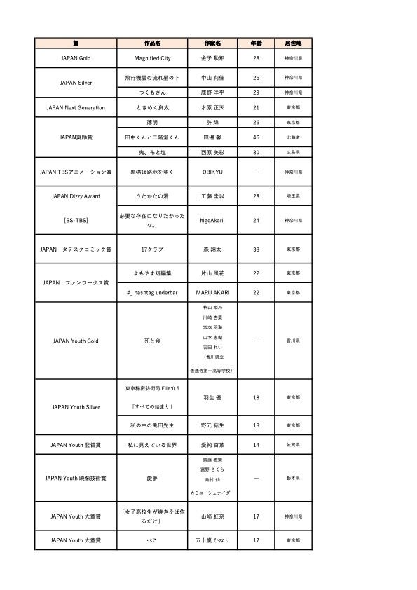 今回の作品応募数は、過去最多となる458点。また、応募者年齢は10歳~78歳だった。山田亜樹フェスティバルディレクターは、「実写もアニメも表現の幅が広がり、Youth部門では毎回応募してくれる若者がめきめき腕を上げ、コンテストを主催する喜びもいただきました」と語った。