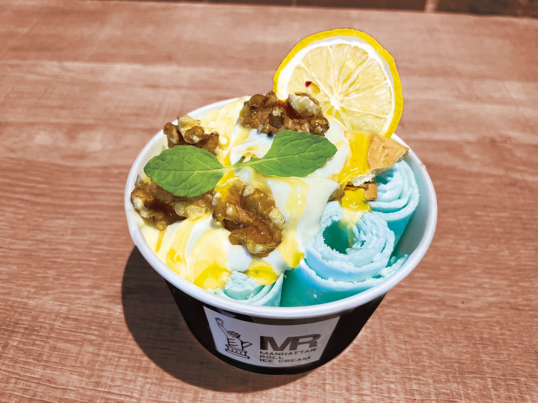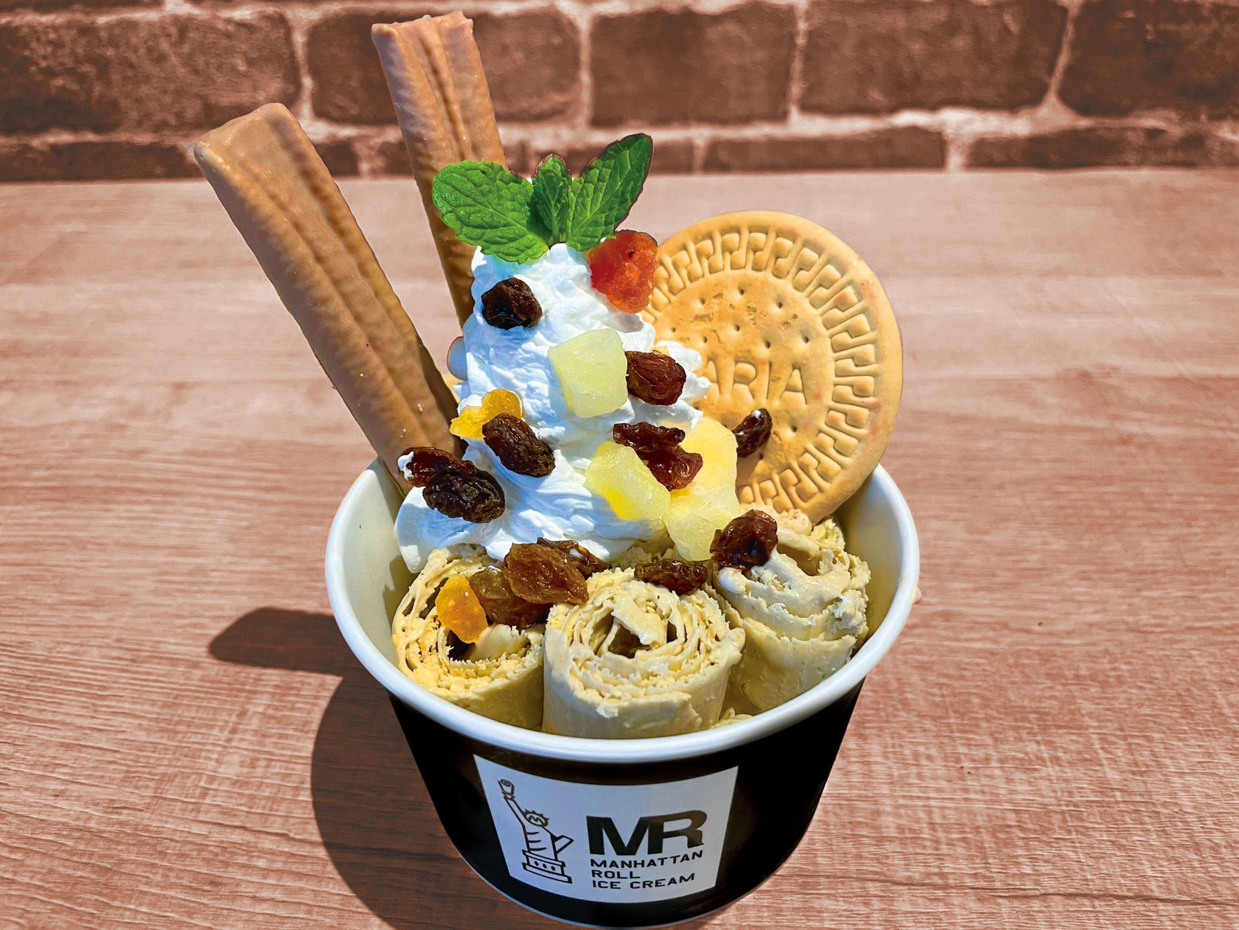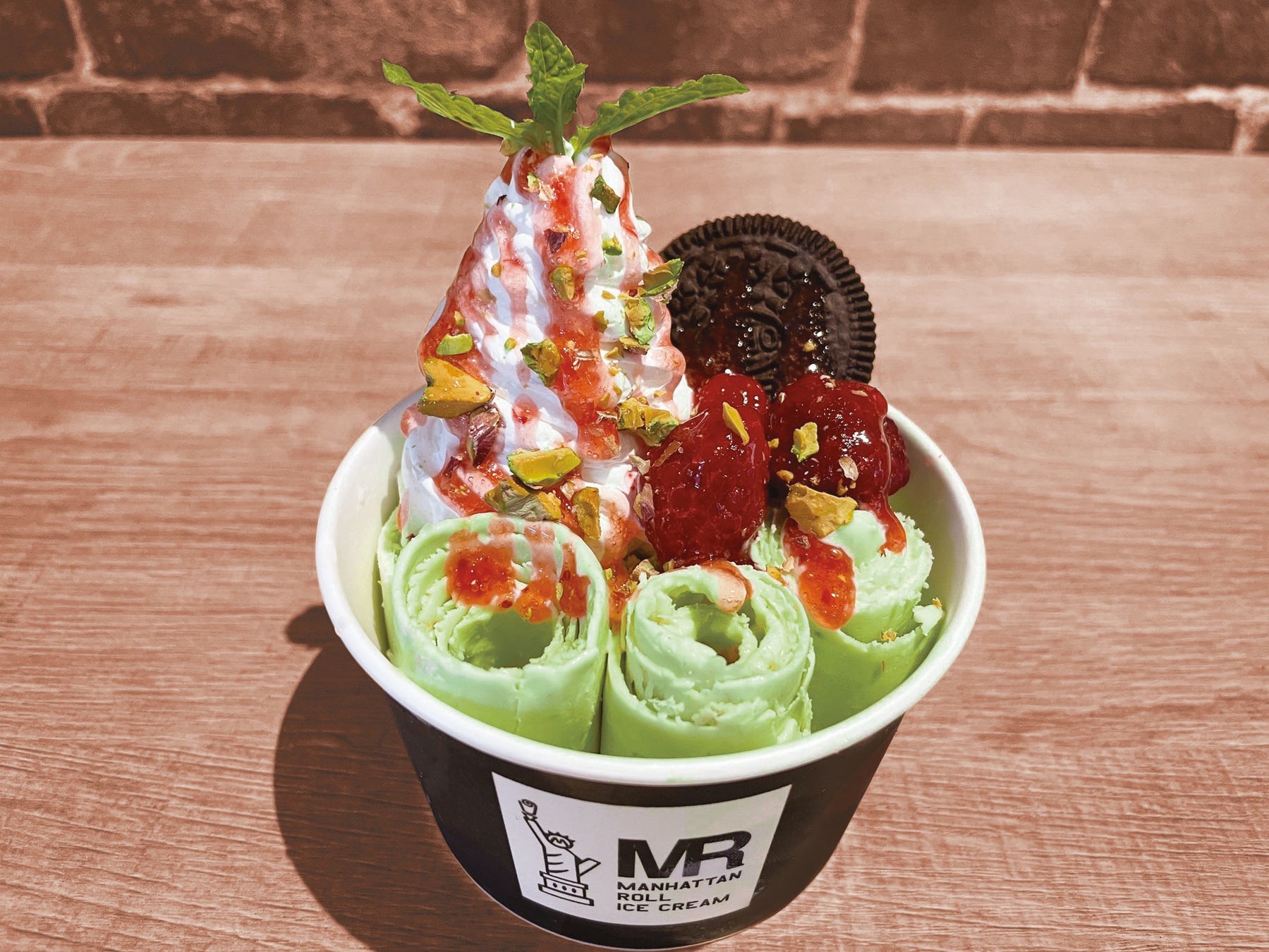 ロールアイスとは、マイナス20度以下のコールドプレートの上に、液状のアイスベースを乗せ、固まったものを薄く伸ばして丸めたアイスの事です。当店では、オリジナルのアイスベースに、様々なフルーツやチョコなどを追加することで、多様なメニューをご用意しております。味のベースとなるアイスにもこだわり、一般的なアイスに使われている卵を使用せず、店舗にて牛乳、生クリーム、シロップを独自の配合で合わせる事で、滑らかで濃厚なのに、甘すぎないアイスクリームを実現。またトッピングやアイスのベースには、フレッシュフルーツ(冷凍ではないもの)を使用する等、見るだけでなく味でもしっかり満足して頂けます。
