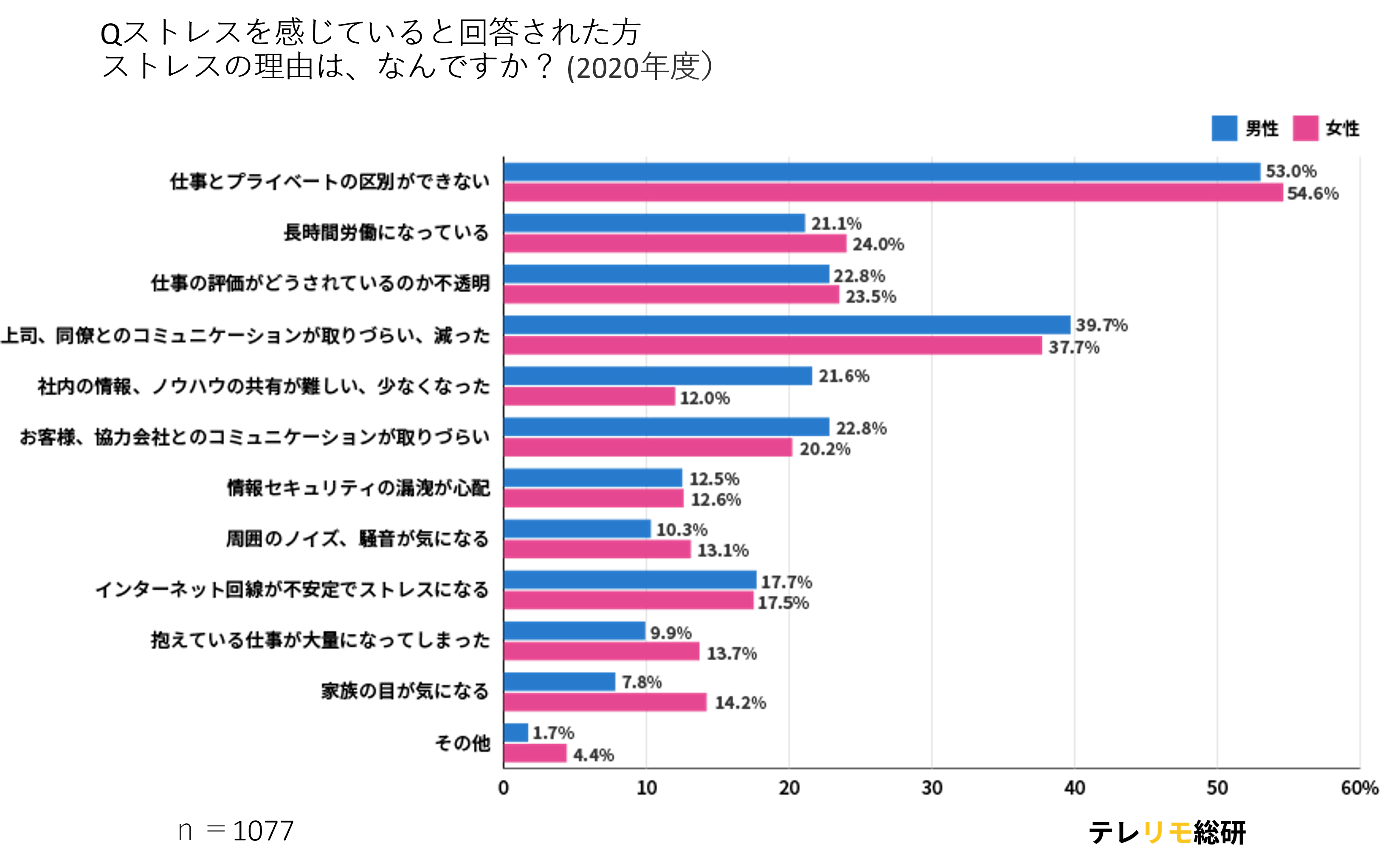 はじめに、「仕事とプライベートの区別ができない」という項目に関しては、2020年の調査で男性が53%、女性が54.6%であったものから、男女ともに5%以上回答が増加しています。