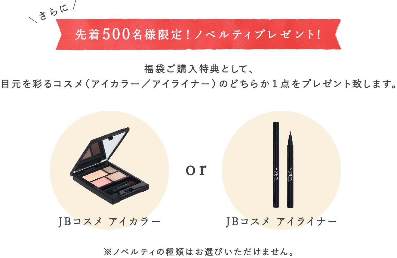 さらに、福袋購入特典として、先着500名限定で目元を彩るコスメ(アイカラー / アイライナー)のどちらか1点をプレゼント致します。