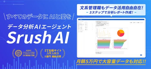 事業内容:対話型データ分析AIエージェント「Srush AI」を中核に、データ統一クラウド、データ活用伴走サポート、データ人材育成プログラムの企画・開発・運営・販売を一体的に提供