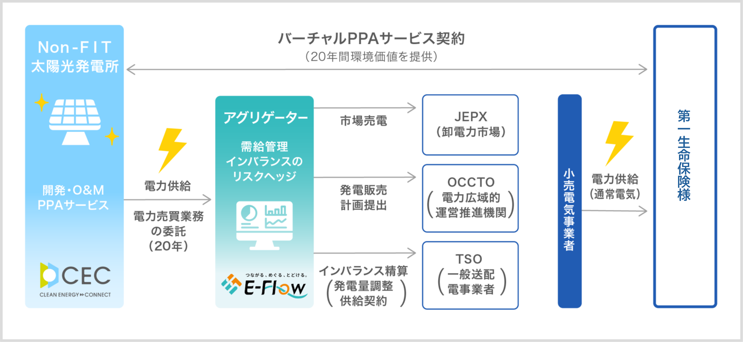 E-Flow合同会社(関西電力株式会社の100%子会社。社長:川口公一、以下「E-Flow」)と株式会社クリーンエナジーコネクト(代表取締役:内田鉄平、以下「クリーンエナジーコネクト」)は、バーチャルPPAサービスにおいて業務提携しており、この度、新たにクリーンエナジーコネクトが第一生命保険株式会社様向けに提供するバーチャルPPAサービスにおいて、協業いたします。