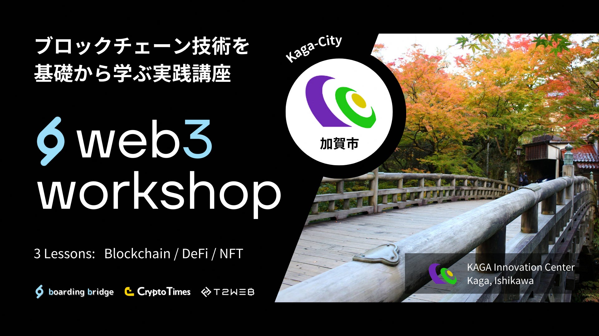 日本最大級のweb3コミュニティ「boarding bridge」が主催となり、石川県加賀市(市長:宮元 陸)で「web3 workshop in 加賀市」を開催することになりました。web3ワークショップは、ブロックチェーン技術やDeFi、NFTなど、web3の基礎を学びたい人向けの実践講座です。どなたでもお気軽にご参加ください。