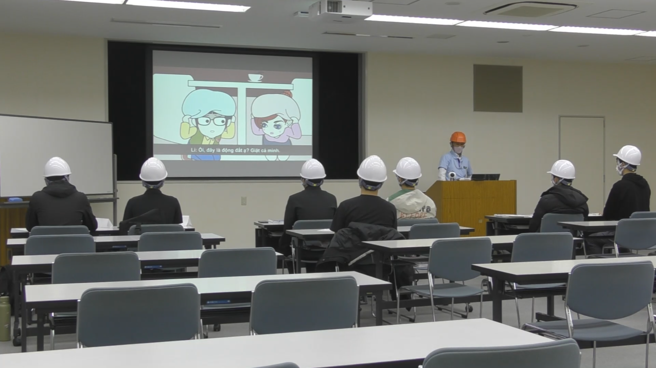 CEA大阪で、ベトナム人実習生がベトナム語通訳のもと防災講習を受けている様子