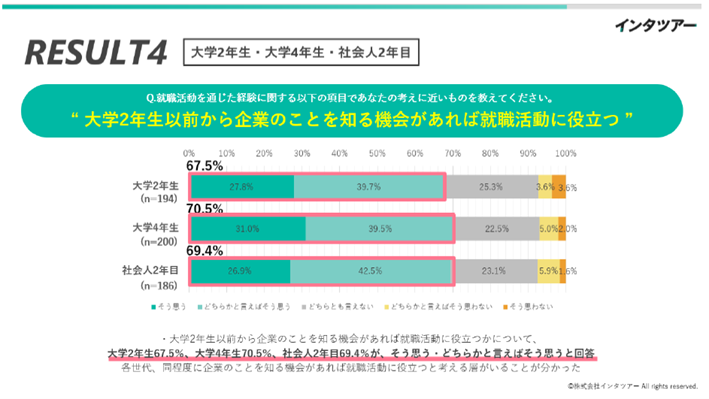 また、大学1,2年生の中には、早期から就職活動を始めたいと考える学生も多くいます。株式会社インタツアーが独自に行った調査によると、大学2年生より前から企業のことを知る機会があれば就職活動に役立つと回答した大学2年生は67.5%に上り、早期から社会との接点を求めていることが分かりました。