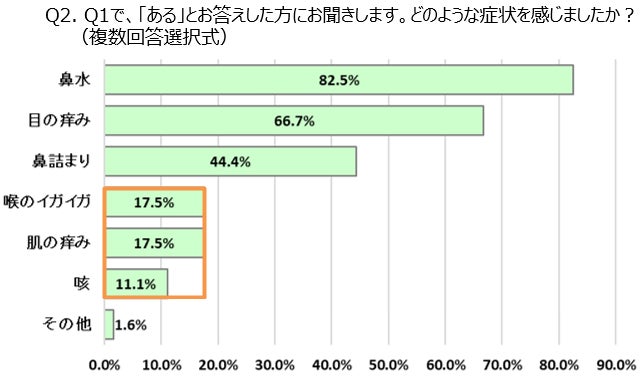 一方で、「喉のイガイガ」や「咳」といった風邪のような症状や、肌の痒みを感じる方が存在することから、秋の花粉症特有の症状を感じている方も一定数いることが分かる結果となりました。