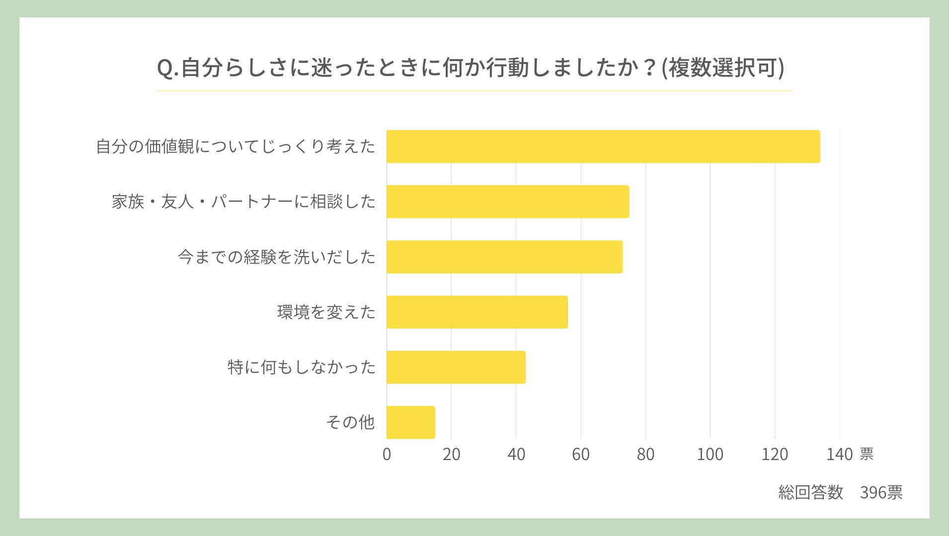 調査で「自分らしさについて迷ったときに変化した価値観はありますか?」と尋ねたところ、もっとも多かったのは「自分が「したい」と感じる物事に集中するようにした」(128票)でした。