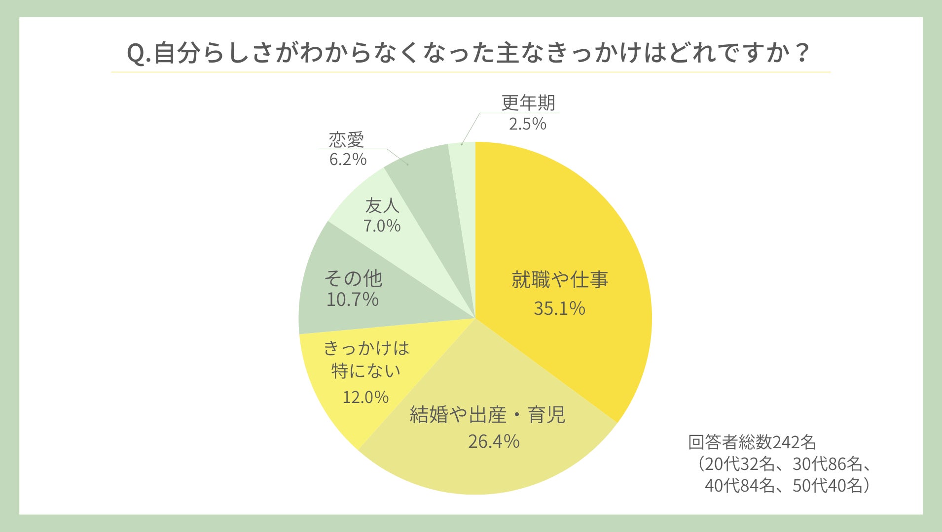 就職や転職、結婚や出産といったライフステージの変化を伴うイベントのときに「自分らしさって何だろう?」と悩む女性が多いようです。