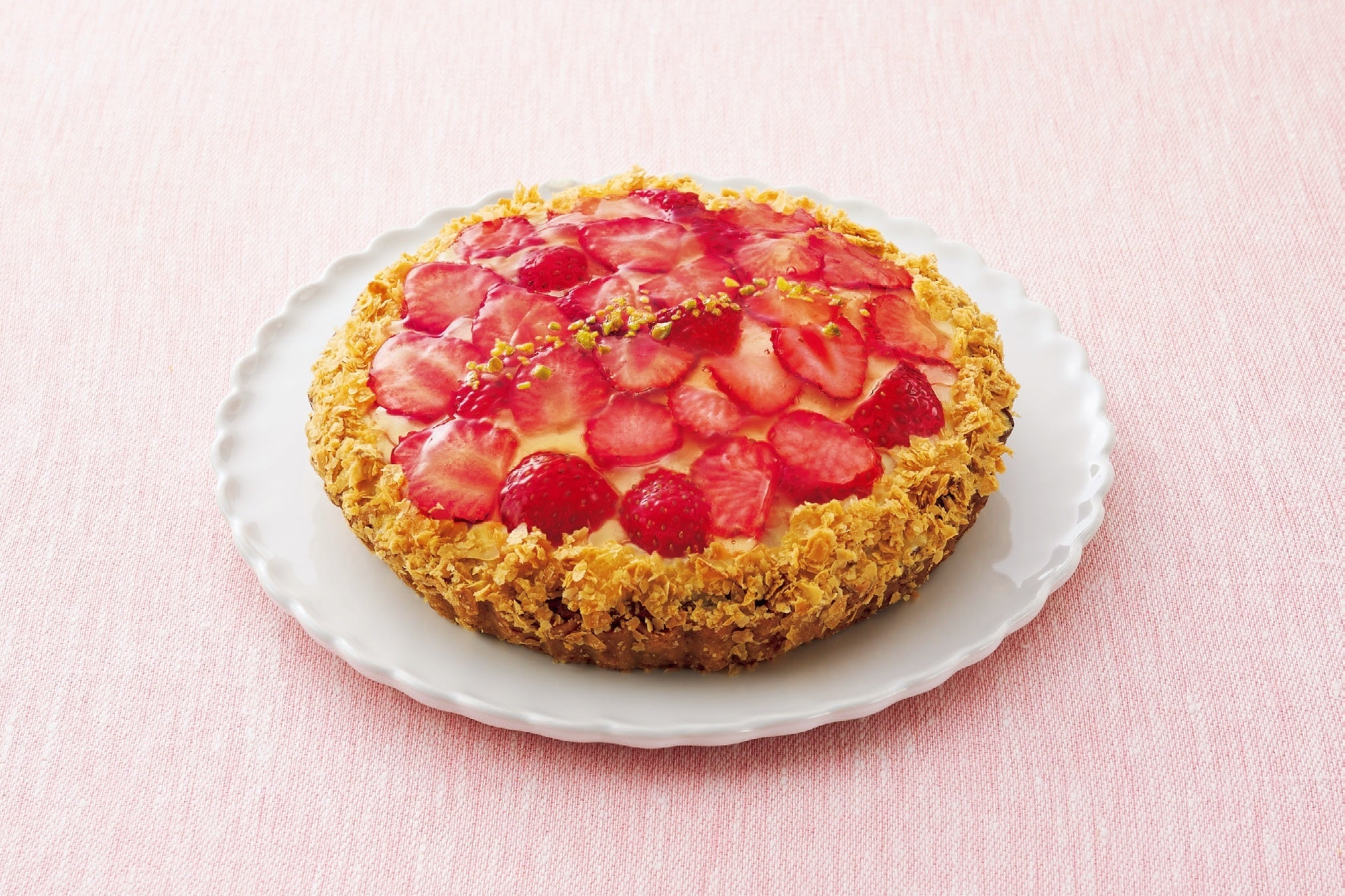 クラッシュしたアーモンドを敷詰めて焼いたサクサク香ばしいタルトの上に、生クリームとカスタードクリーム、旬の新鮮な苺をたっぷりのせた華やかなタルトです。