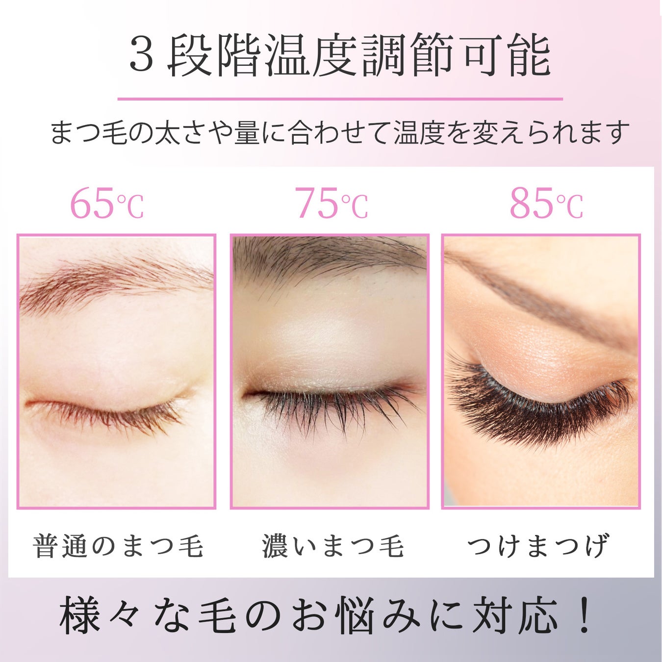 ✅【三段階温度調節】市販の製品は一段階、二段階温度しかないが、本製品は三段階温度が調節できます。その日の気分やメイク、まつ毛の太さや量によって、まつ毛に当たる部分の馴染みが良く、かなり上向きにカールを仕上げます。