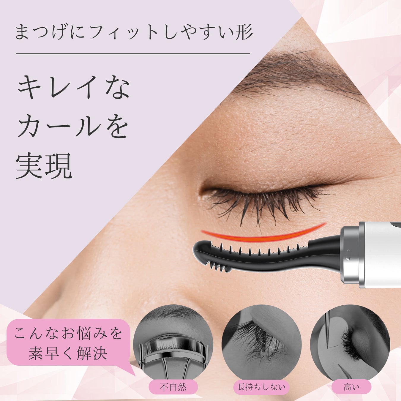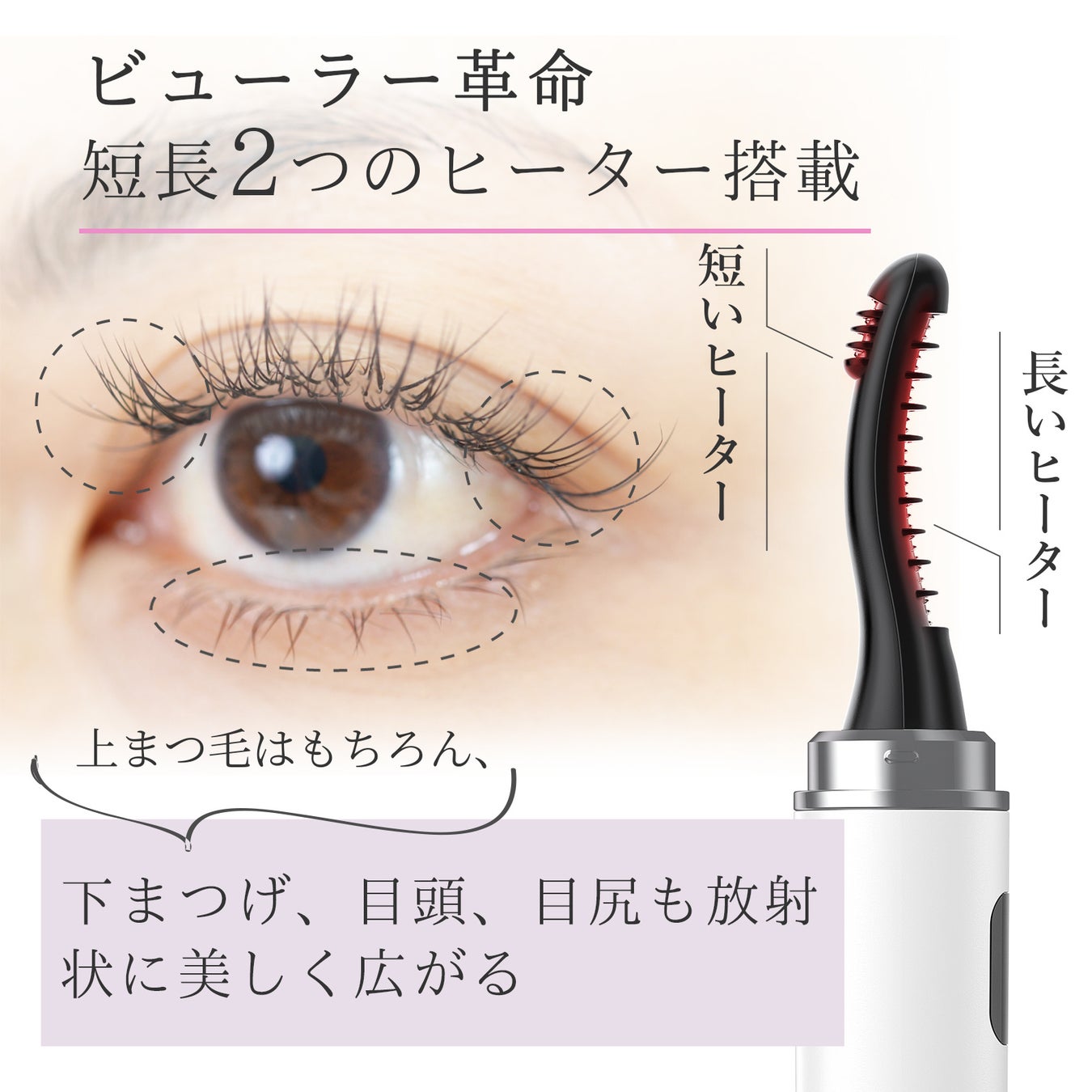 ✅【2つヒーターの組み合わせ】長いヒーターは上まつげにフィットしやすい形状で中央のまつげをしっかりカールして、短いヒーターは目尻や目頭、さらに下まつげまでカールをつけやすく、操作しやすい。