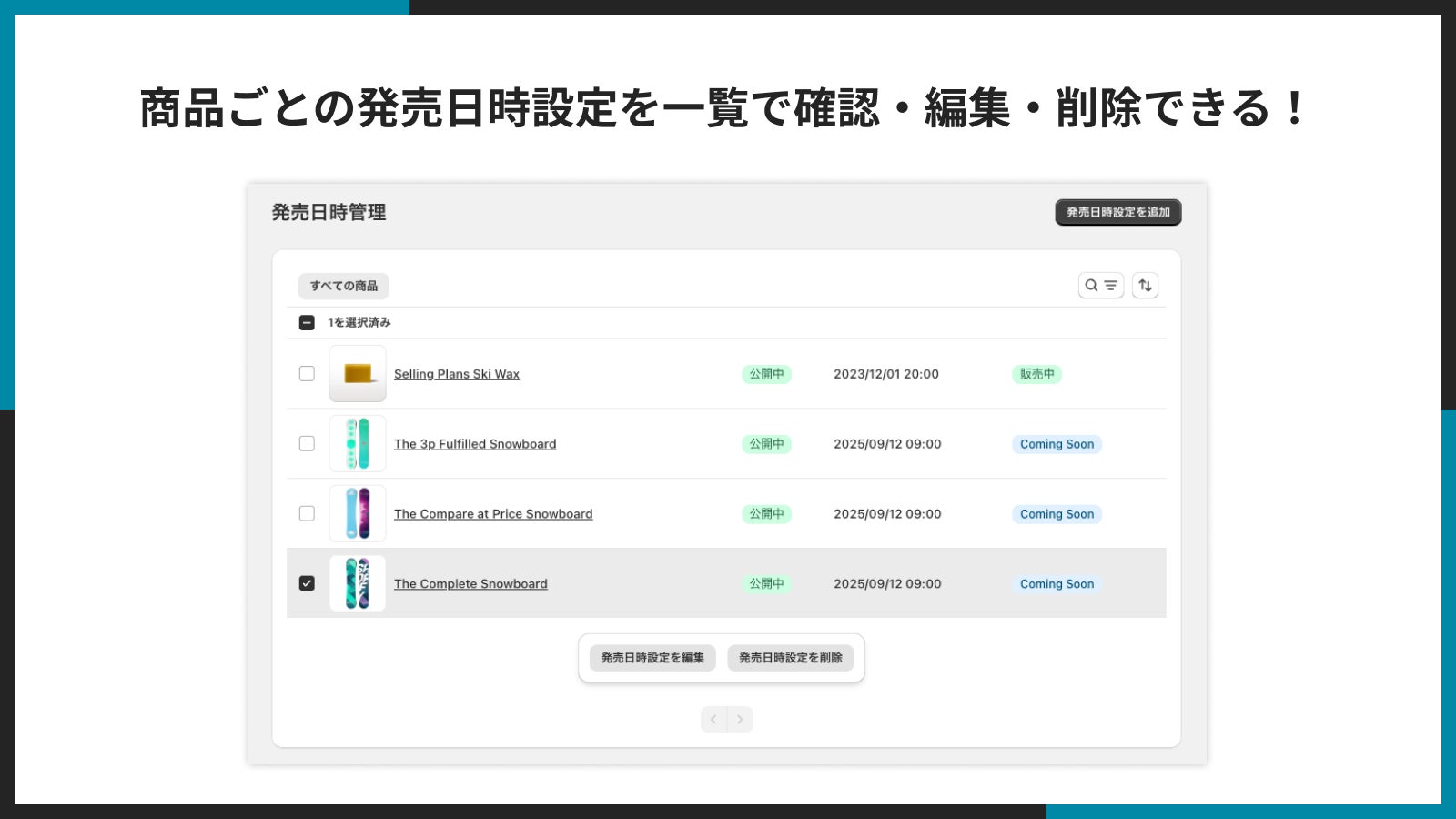 「シンプル Coming Soon|商品ページ発売予告アプリ」は、商品ごとの発売日時を一覧で確認・編集・削除することができます。発売日時を一括で削除・編集したい場合は発売日時管理から削除・編集したい商品を選択することで、一括削除・一括編集ができます。