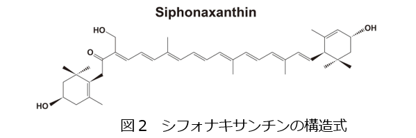 シフォナキサンチンは海藻のミルや海ぶどうなどの大型緑藻と一部の微細緑藻が生産するカロテノイド色素の一つで、藻体内では緑色や青緑色の光の吸収に働いていると考えられています(図2)。