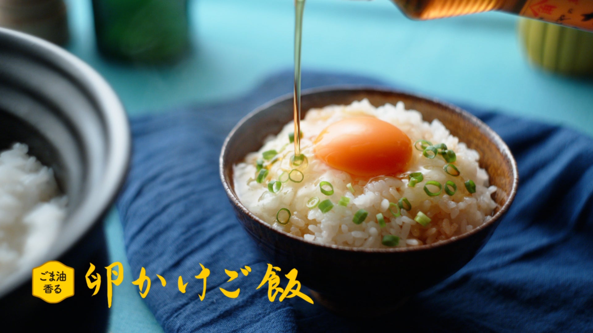 かどやの純正ごま油は、かけるだけで、料理が本格的になるので、ついついどんな料理にも注いでしまう…。そんな様子を、本作品を通して表現しています。映像では、いいことを思いついたかのように卵かけご飯に、純正ごま油を注ぐ女性が登場。卵かけご飯にとどまらず、刺身やうどんにも注ぎたくなり、純正ごま油の香りと、いつもの料理が簡単においしくなったことで満足げな表情をする「ごま油を注ぎたい女」が描かれています。