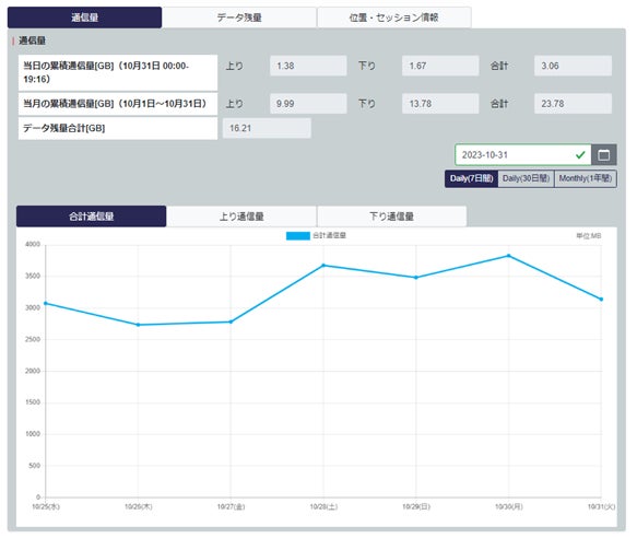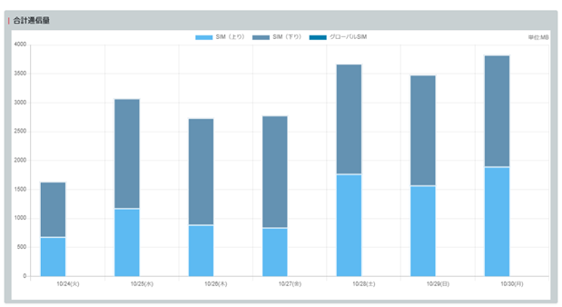MEEQコンソールにて、上り下りを合計したデータ通信量や回線ごとのデータ残量の表示に加えて、以下のデータ通信量が上り下り別に表示できます。