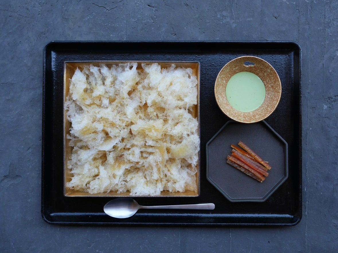 海と山、自然に囲まれた土地、松をはじめ多くの植物が茂む庭園、波の音やセミの声に夏盛を感じられる沼津倶楽部。当施設では、お茶や天然水氷が主役となる、素材の良さをシンプルに引き出した味わい、夏を感じられる果実味ある夏氷をご用意しました。味を構成する要素を3つに限定し、一皿の中に、香り・塩味・苦味・果実味が楽しめ、食べ進む中で味わいが完成します。天然水氷をふんわりと繊細に削り、静岡県焼津市で創業70年以上続く老舗茶屋「丸玉園」のほうじ茶、和紅茶を使った自家製シロップを合わせます。アクセントになる味噌餡や煎茶クリームが果実と氷を繋ぎ、調和した風味を演出します。