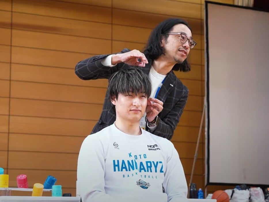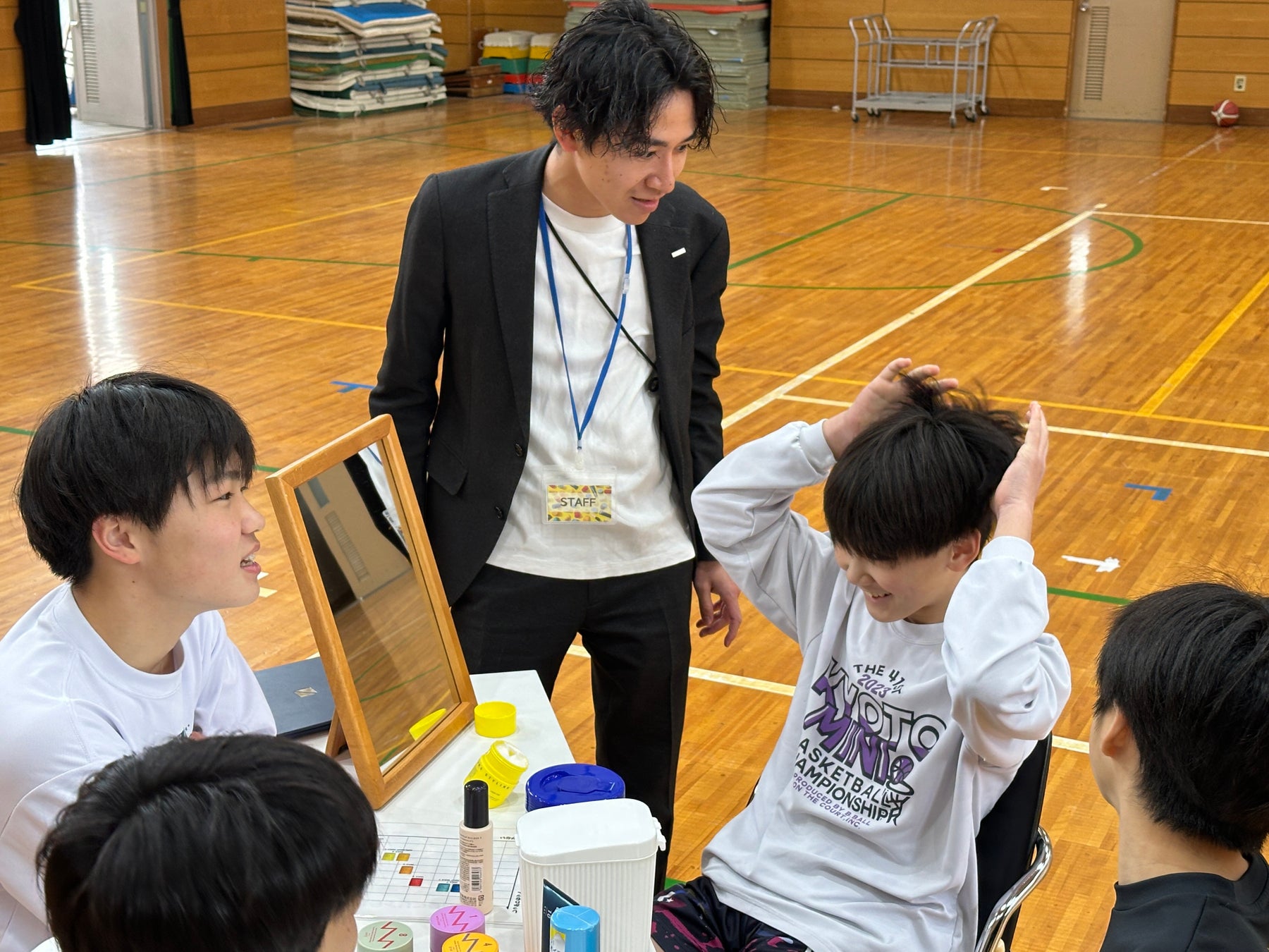 「京都ハンナリーズ」の水野幹太選手をモデルに、当社インストラクターによるヘアスタイリングデモンストレーションを実施。スタイリングのポイントを教わりながら、“かっこよくキマる”瞬間を視覚的に体感。