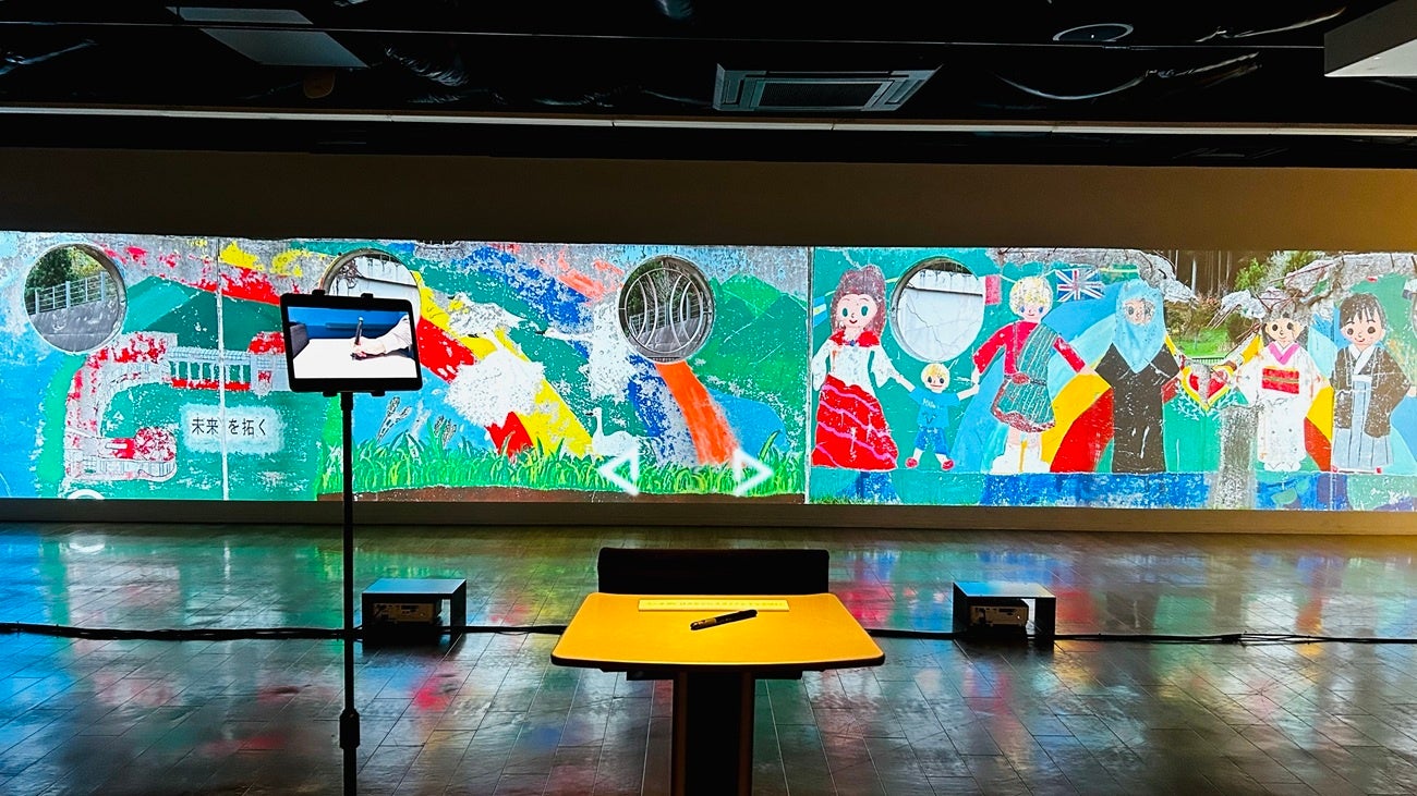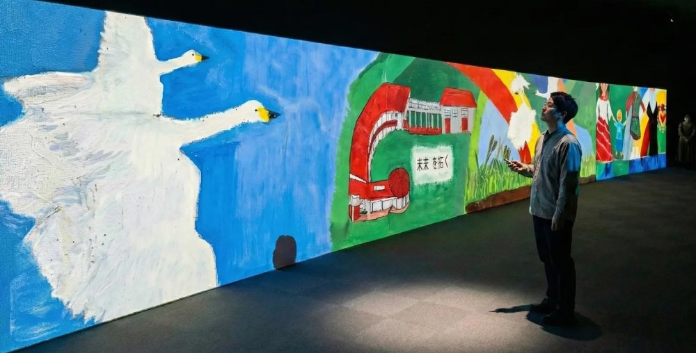 「拓く」は、大川小学校の壁画を実寸高で投影する参加型映像インスタレーション作品です。現在、風化が進む壁画をAI技術などを用いて完成当時の姿へ再現。来場者は、壁画を"修復する"体験を通して、震災の記憶や言葉と向き合い、未来への願いを共に育み共有する場を創出します。