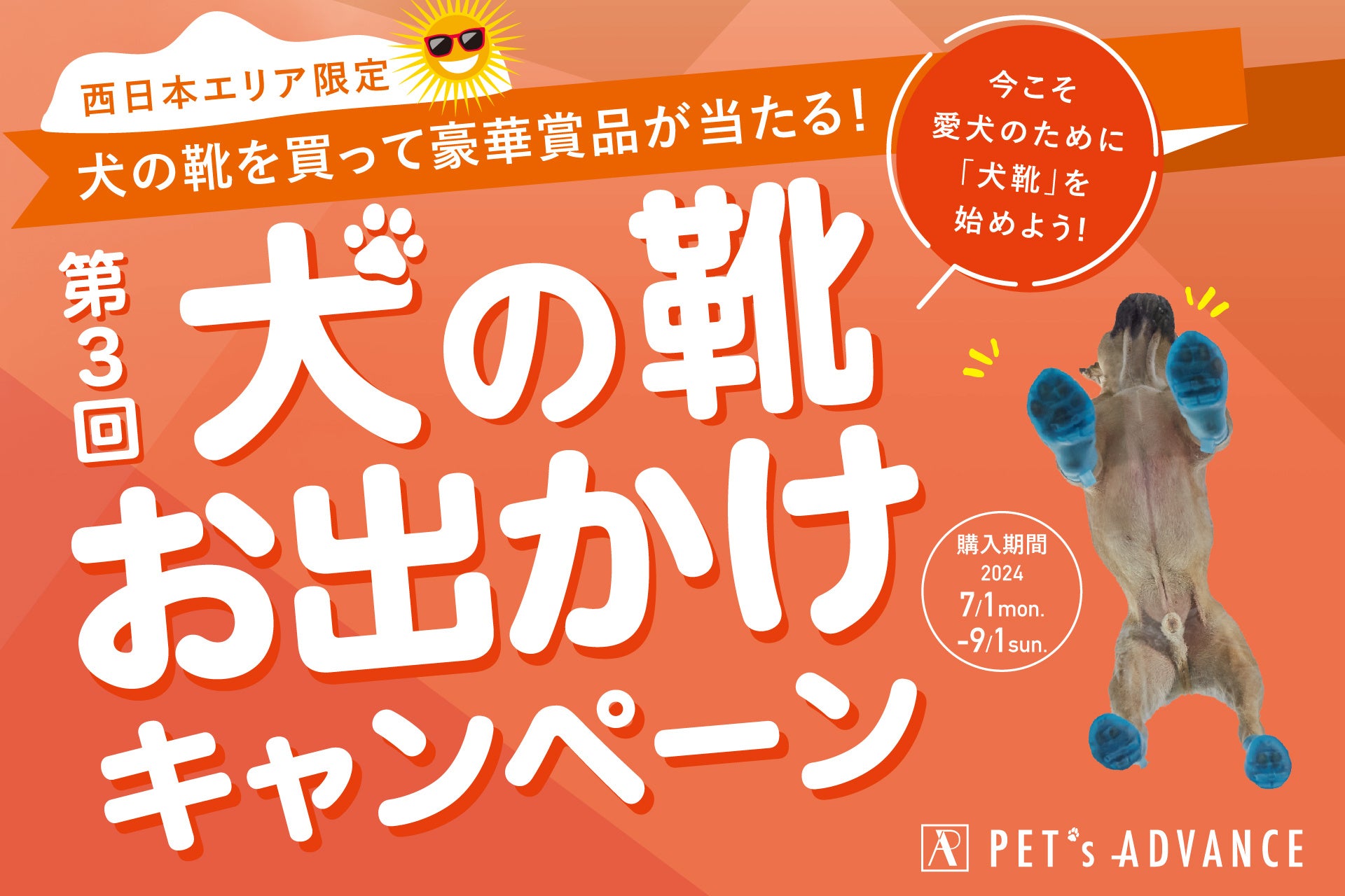 株式会社ピカコーポレイション(本社:大阪府東大阪市、代表取締役社長:坂口泰生)が展開するペット製品ブランド「PETs ADVANCE(ペットアドバンス)」( https://petsadvance.jp/ )は、対象の犬の靴をご購入のお客様に豪華プレゼントが抽選で当たる「犬の靴お出かけキャンペーン」を7月1日(月)より西日本のペット用品販売店で、開催いたします。