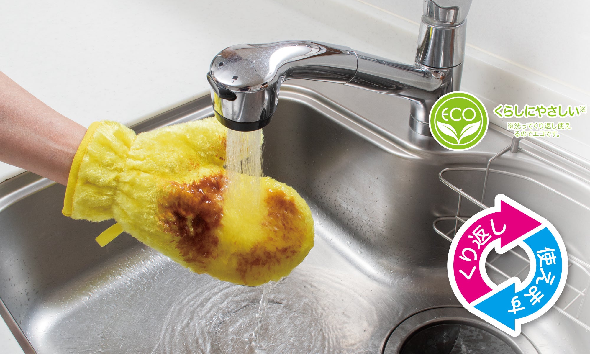 ミトンで拭き取った油汚れも洗剤不要!なんと水だけで簡単に落とせます。使い捨てではなく、くり返し使えるのでとってもエコ。